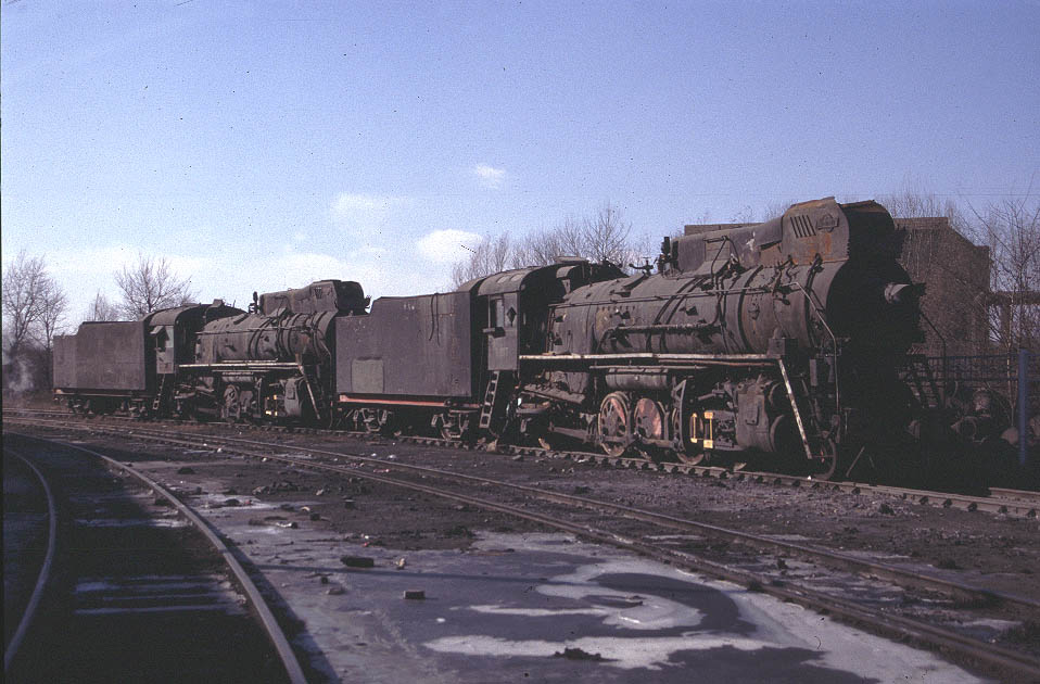 | A pair of JS class locomotives standing outside the repair shops at Anshan steelworks on 8th January 1999. Anshan had a very varied fleet of locomotives - one of its great attractions |