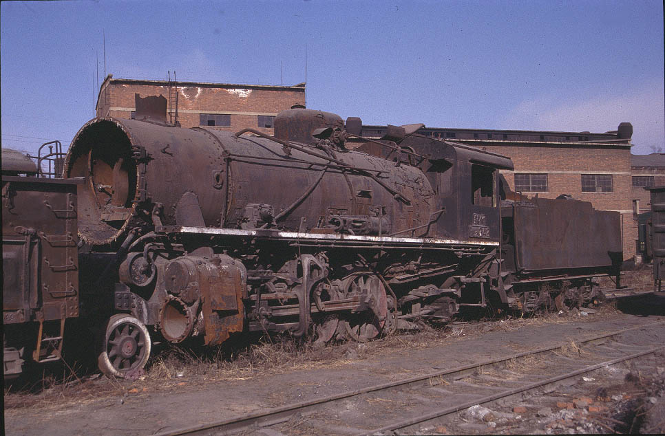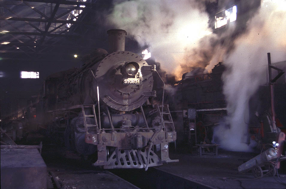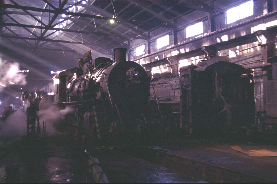| SY0834 standing inside the repair shop at Anshan. The combination of low light, steam, smoke and dust made photogrphy extremely difficult in 1999. How different it might have been with a digital camera! |