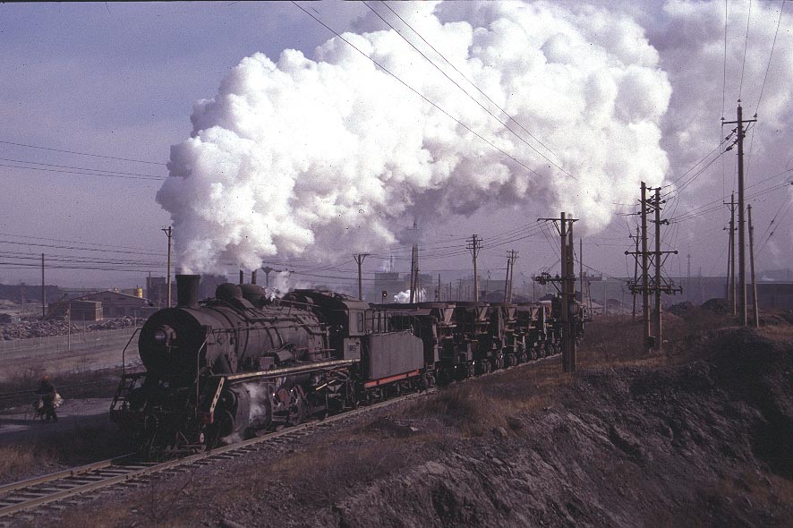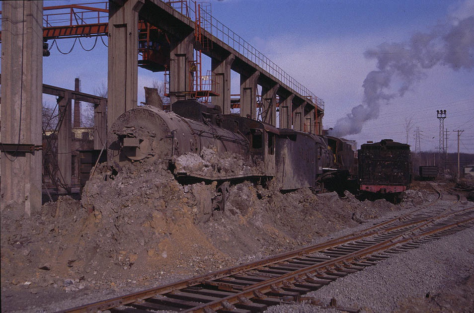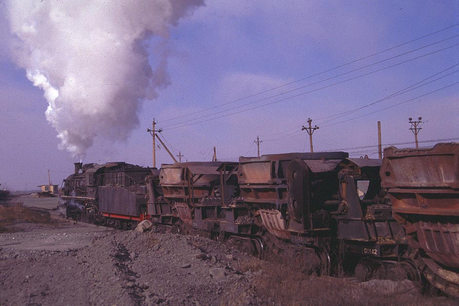 | "Now we take you to see something very special", said our local guide and we headed off to watch the dumping of molten slag which has come from the blast furnaces. Class SY 2-8-2 No.0436 heads a train of cauldron wagons towards the slag dumping tip |