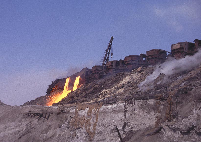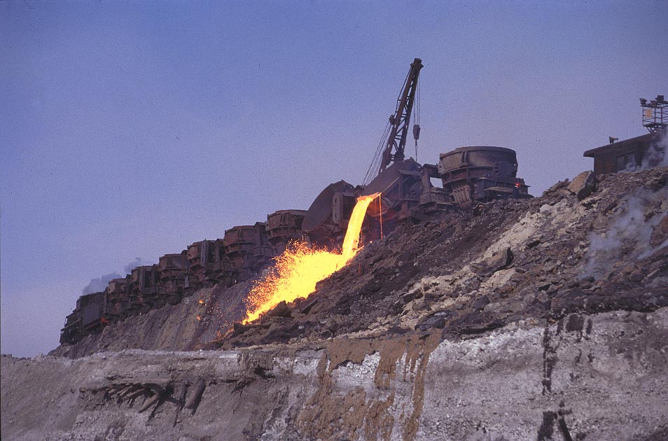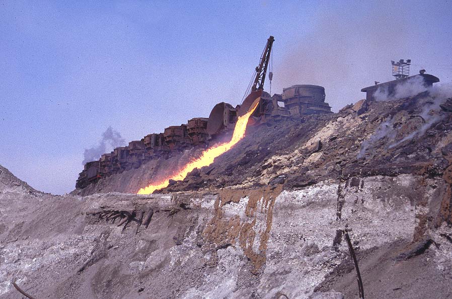 | Something special? What an understatement that turned out to be! The actual tipping process took some condiderable time with wagons being emptied two at a time. During the journey a thin crust of solidified rock had formed across the surface and this had to be broken up using a crane with a ball. The wagons were then tipped and the molten rock flowed down the side of the bank. Even from a 'safe distance' it was possible to feel the enormous blast of heat as the wagons began to discharge their load of molten slag. A nearby lake was the only unfrozen expanse of water for miles around - a testament to the effect of the 'pour'. Once most of the molten rock had been emptied from the wagons the crane was employed again - this time to dislodge the solidified material around the sides of the wagon. Once this had been completed the next pair of wagons were empted .... and so it continued until the very last wagons had discharged their load. It was a totally compelling spectacle which even these pictures fail to truely convey. Sadly the death of a Japanese visitor brought an end to visits to this particular part of the site shortly after our own visit and only long distance views were available to future visitors |