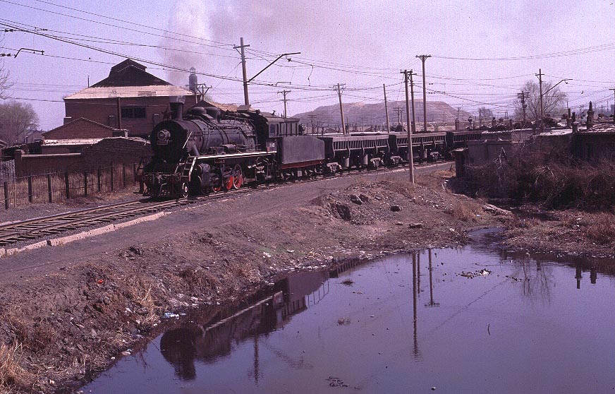| This is steam in an industrial setting in a country with a rapidly developing economy. A point perfectly illustrated by this shot of SY1460 bringing back wagons from the open cast pit past a pond in which I certainly would not wish to swim! No dramatic sweeping viaducts or dramatic mountain scenery on this system! |