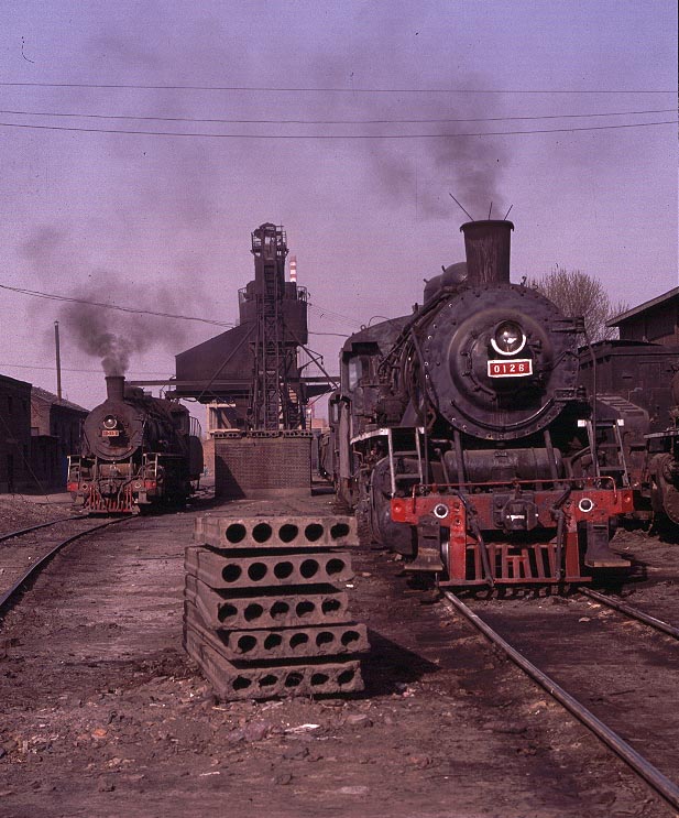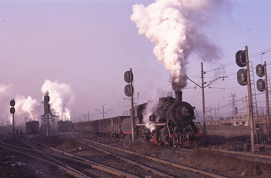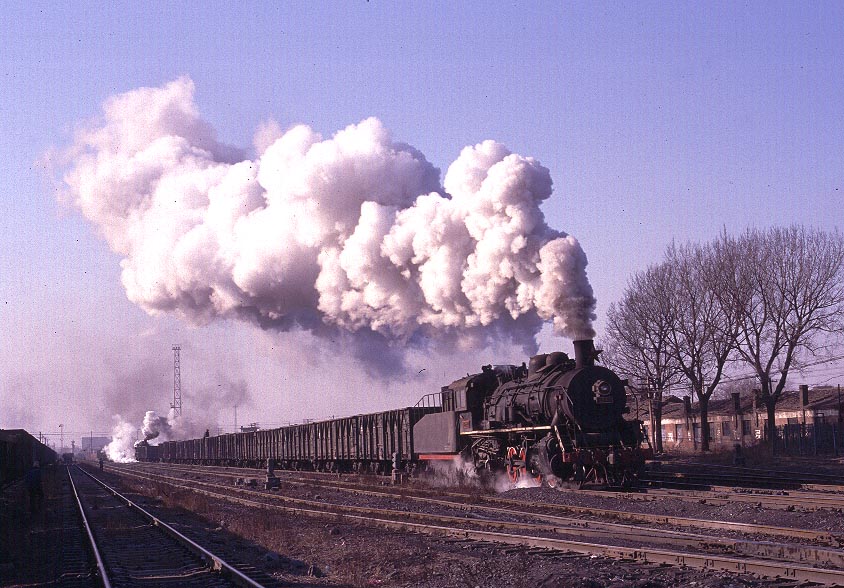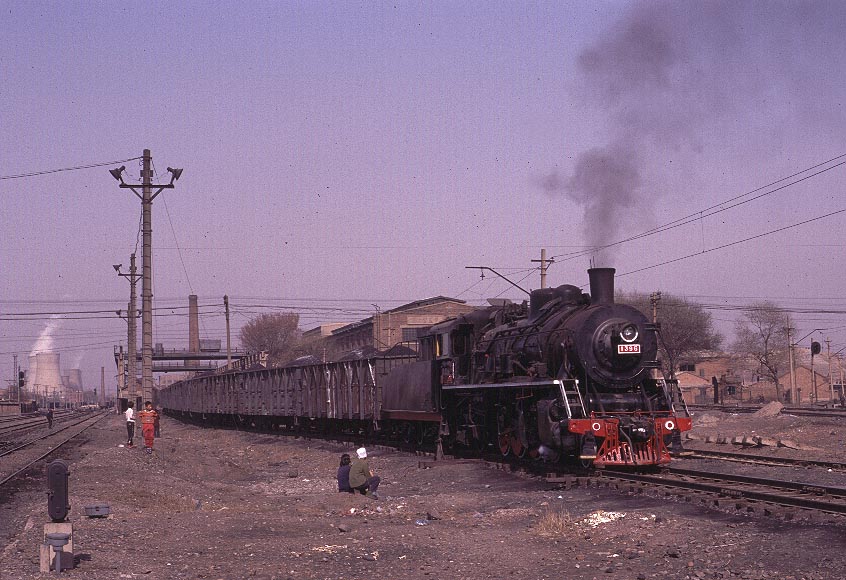 | FUXIN Finally some good news! As of June 2007 the steam situation at Fuxin seems to be relatively unchanged since my last visit at Christmas 2003. As yet there are only sketchy reports of a single diesel although the system has long had its roster of (ancient) electric locomotives which share the work on this extensive system. Fuxin may therefore be one of the last main steam centres in China and should be high on the list of places for a newcomer to the Chinese steam scene to visit. As always - go soon for who knows how long it will last. Fuxin is located in Liaoning Province and is fairly easily accessible by train from either Shenyang (about 180km) or Jinzhou (120km). It is a very large city with a population approaching 700,000. Before 1998 this area was out of bounds to foreigners but since that time it has become very popular with visiting enthusiasts due to the intensity of steam operations to be found there. All steam activity now takes place of the mine railway which serves a very large open-cast pit and two deep pits situated to the north and south of Fuxin. There was an extensive electric railway which carried most of the coal from the open-cast pit and steam locomotives entered this complex on track maintenance trains. However reports in 2006 suggest that the railway into the big pit is greatly reduced and no longer electrified but details are limited. The main steam action occurs between the two mine railway stations situated to the north and south of the power station which dominates this part of the city. A walk from Tiaping to Wulong station takes in the majority of the action including both stabling points, the main shunting yard and the repair shops. The line is solely worked by SY class engines although a JF and a YJ were seen out of use during my visit in April 2002. Most of the activity involves tripping wagons backwards and forwards and long trains of wagons are fairly rare. Locomotives face both north and south and therefore engines working tender first are reasonably common. There is also a passenger service which now appears to be limited to two trains a day in each direction - considerably reduced from a year or so ago. However the action is intense with locomotives or trains passing by every 10 - 15 minutes or so throughout the day plus engines going on and off the stabling points for coal and water. The shots below were taken during three visits to the system - twice in 2002 and again at Christmas 2003. Of interest to the photographer may be the fact that the quality of light varies considerably according to weather and pollution levels. The recent clearances of the hulongs may alter the latter - pray for a cold crisp day and you will surely have an amazing experience. |
