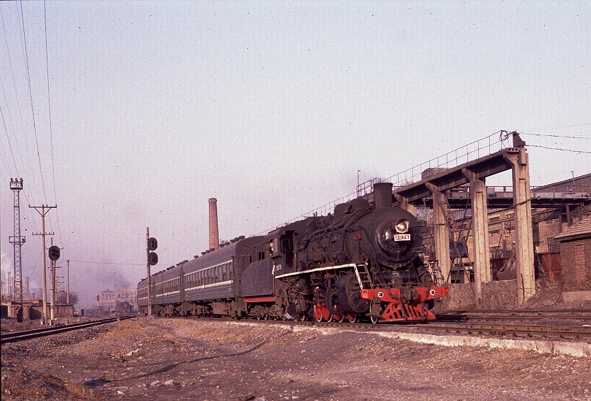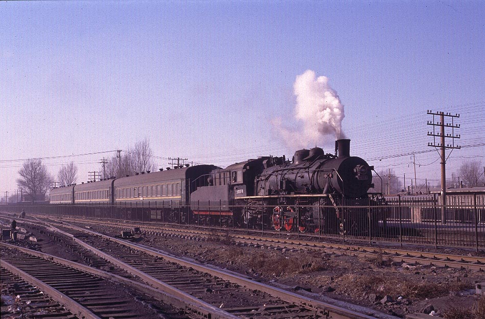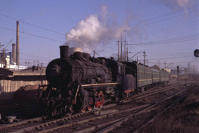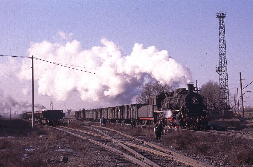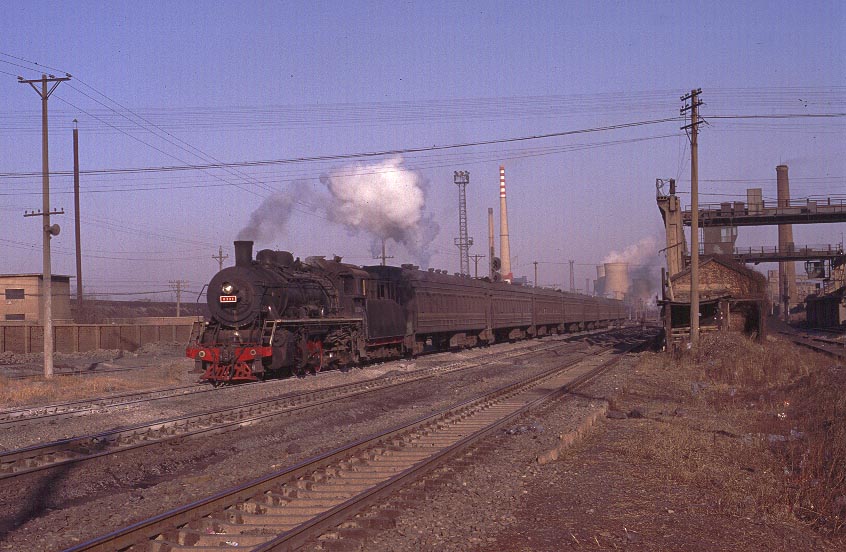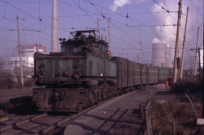 | Definitely not working steam! The rail network at Fuxin is extensive and complex and train workings are undertaken by both steam and ancient electric locomotives. Some lines seem to be exclusive to one or other form of traction whereas other lines are used by both. This workers train is passenger moving at its most basic! The coaches appear to be box cars with flame cut windows and no seating - and certainly no First Class! |