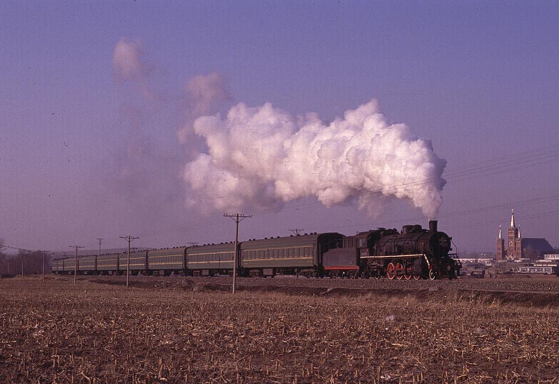 | During my December 2002 visit I bumped into Ron Lingley, a fellow enthusiast from England. We decided that we would try to get a shot in the more rural surroundings of Minzhu with the Catholic church in the background. We secured a taxi and set off - instructing our taxi driver by signs and gesticulations. Once in position we paid him off and waited for SY1376 to do the business. Only then did we realise we had no taxi back to Fuxin! Since we both needed to catch trains to other places this was a concern. After waiting, without success, for nearly 40 minutes to hail a taxi we eventually waved down a passing 4x4. The bemused occupants agreed to take us back to Fuxin - but not before showing off their 'captives' to their local factory! We were regally treated - made tea, given fruit - and deposited back at the station in time for our trains. |