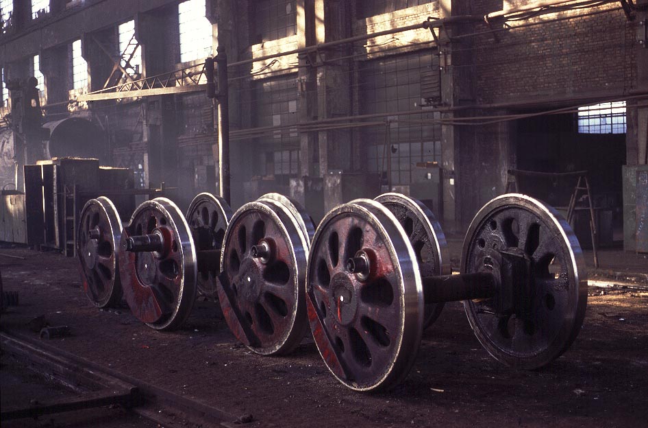 | At Wulong their is a fairly extensive maintenance and overhaul facility. It would appear capable of undertaking all but the heaviest of overhauls (maybe more) but access is normally denied to all visitors. However China increasingly celebrates Christmas and thus it was that on December 25th 2003 it was possible to explore the whole works facility without being asked to leave. Photographic opportunities were fairly limited but this set of SY wheels made a good subject. |