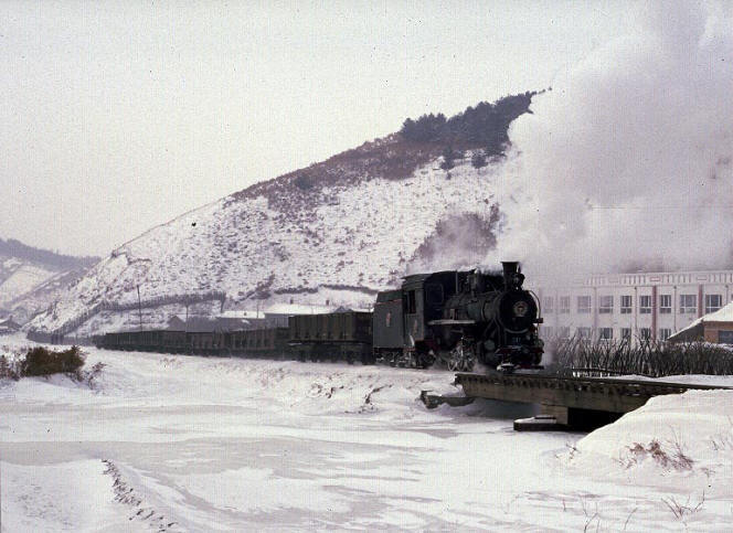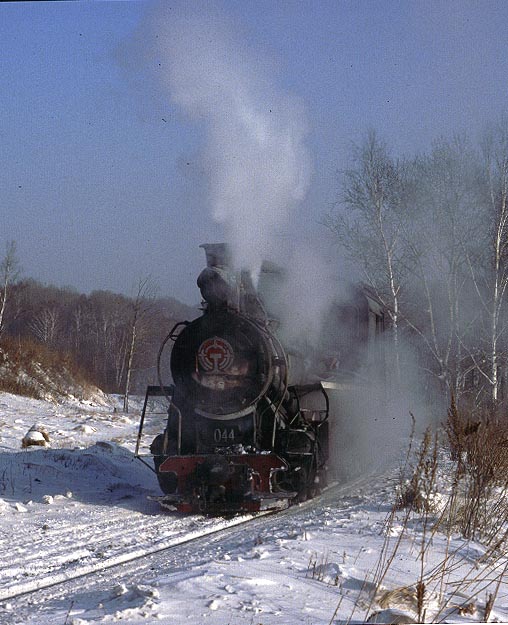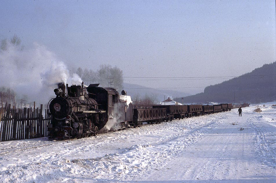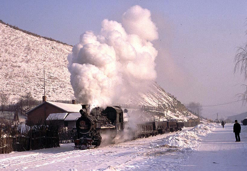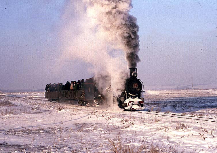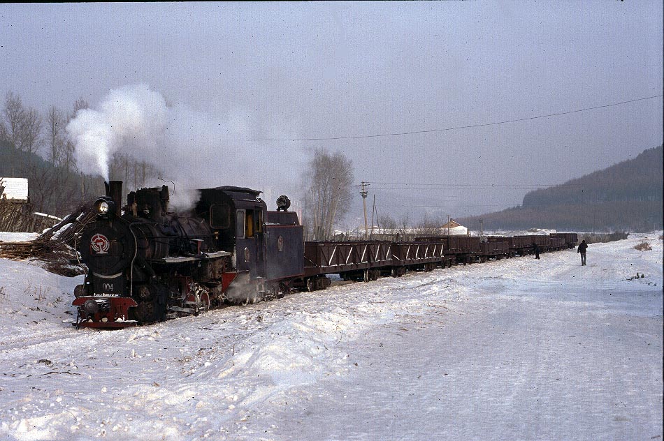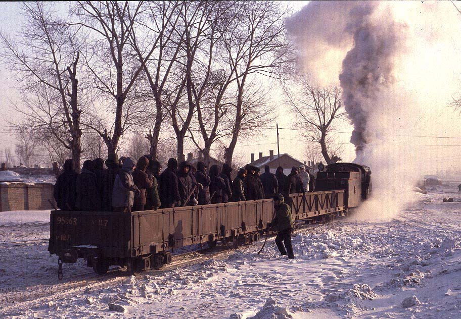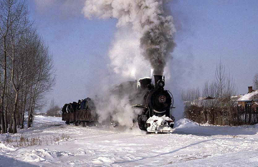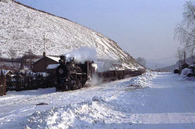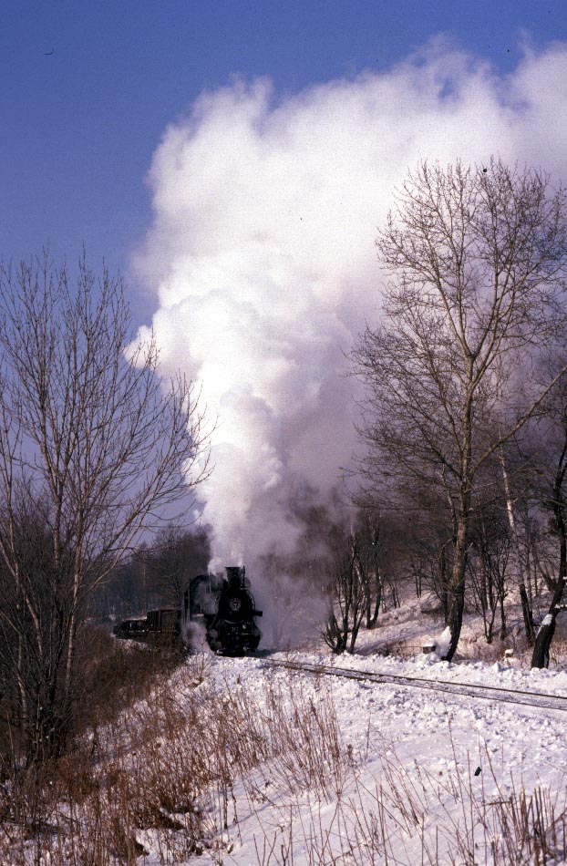 The Huanan Forestry Railway (762mm) is located between Mudanjiang and Jiamusi in the Heilongjiang province of North-East China. The only surviving line runs from the outskirts of Huanan city to a number of small coal mines at Hongguang, a distance of some 47km. Originally this was an extensive system of some 350+km, build in the late 1940's, to carry timber but the forests are now all worked out and the last logging trains ran in 1996. Traffic levels are extremely variable but on a good day there may be up to four trains working in each direction. On a 'bad day' it is possible to stand at the lineside all day without seeing any action at all! Trains comprising eight empty wagons leave Huanan and travel across a long level section before starting to climb near the village of Tuoyaozi. The line winds upwards and round a large horseshoe curve before reaching the summit and descending to Li Xin. The locomotive is turned at Li Xin on a triangle and is used to bank the next full train up to the summit before returning and hauling its train tender first to the mines just short of Hongguang.