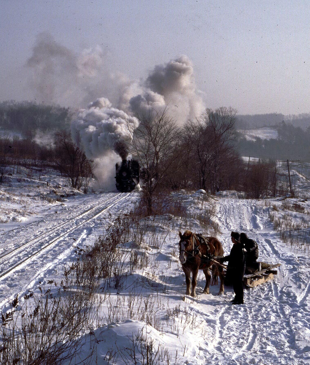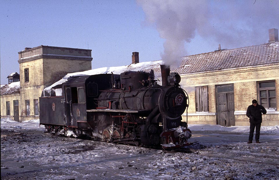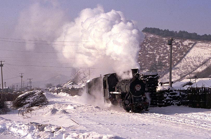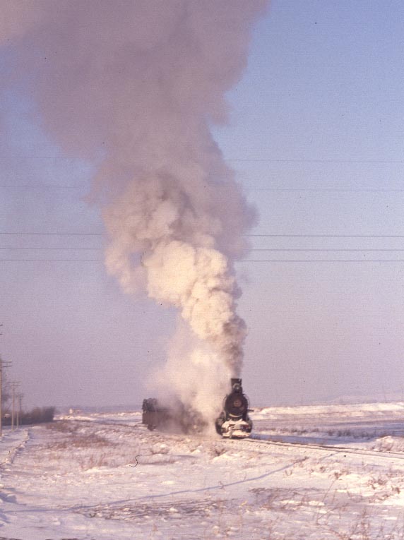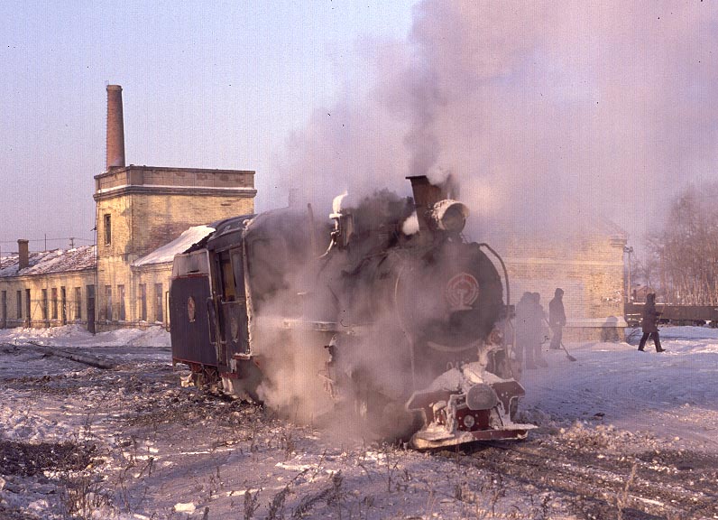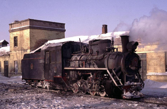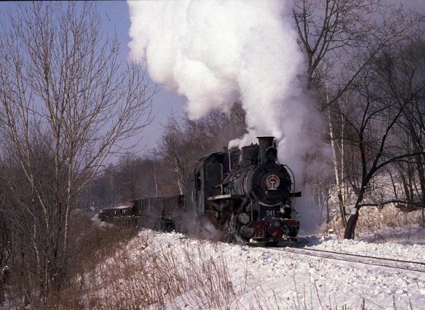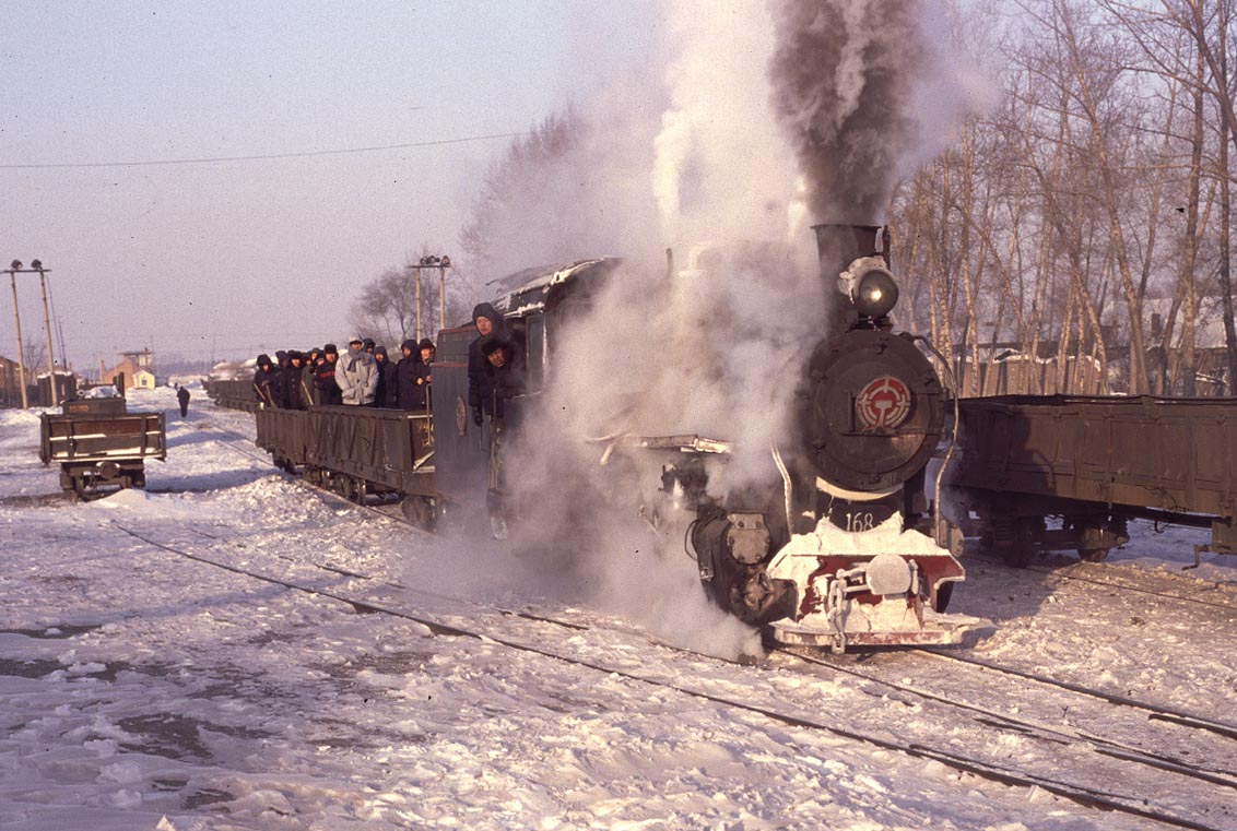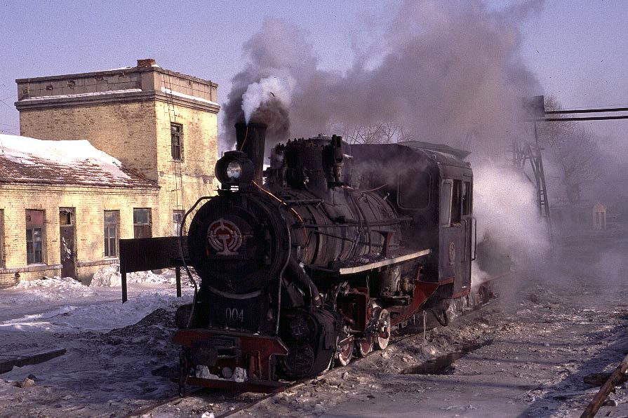 The Huanan Forestry Railway (762mm) is located between Mudanjiang and Jiamusi in the Heilongjiang province of North-East China. The only surviving line runs from the outskirts of Huanan city to a number of small coal mines at Hongguang, a distance of some 47km. Originally this was an extensive system of some 350+km, build in the late 1940's, to carry timber but the forests are now all worked out and the last logging trains ran in 1996. Traffic levels are extremely variable but on a good day there may be up to four trains working in each direction. On a 'bad day' it is possible to stand at the lineside all day without seeing any action at all! Trains comprising eight empty wagons leave Huanan and travel across a long level section before starting to climb near the village of Tuoyaozi. The line winds upwards and round a large horseshoe curve before reaching the summit and descending to Li Xin. The locomotive is turned at Li Xin on a triangle and is used to bank the next full train up to the summit before returning and hauling its train tender first to the mines just short of Hongguang.