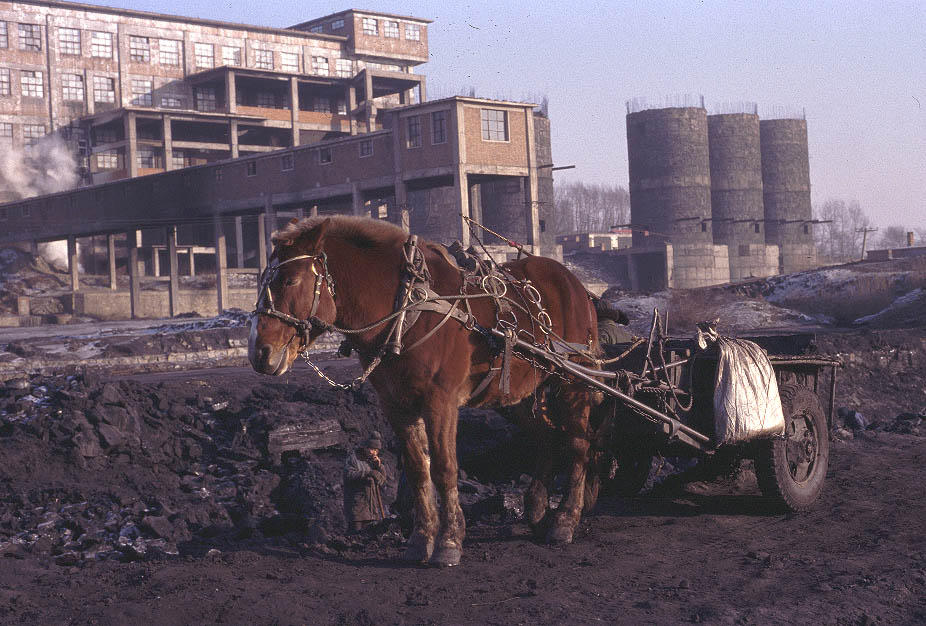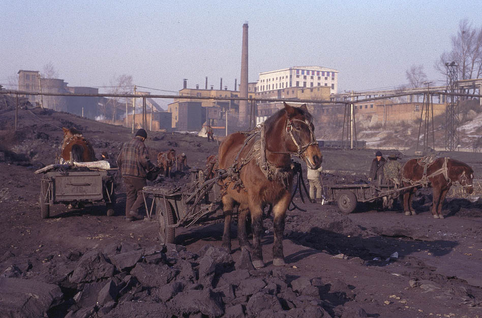 | One of the most interesting features of the Jixi system is the use of 'donkey carts' in and around the washery at Beichang. Coal dust from the washery is collected in large ponds which are then drained and once dried the coal is recovered and taken away in carts. This is difficult and backbreaking work but provides enormous interest to the local scene. |