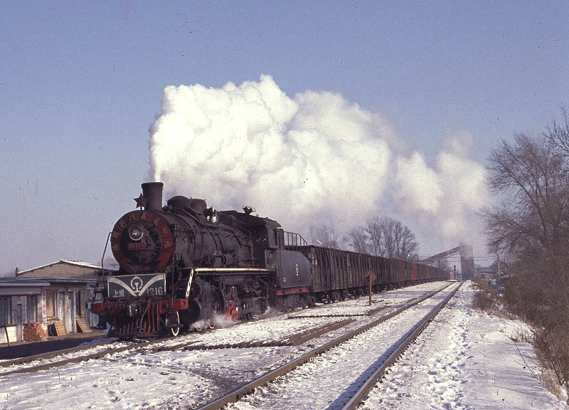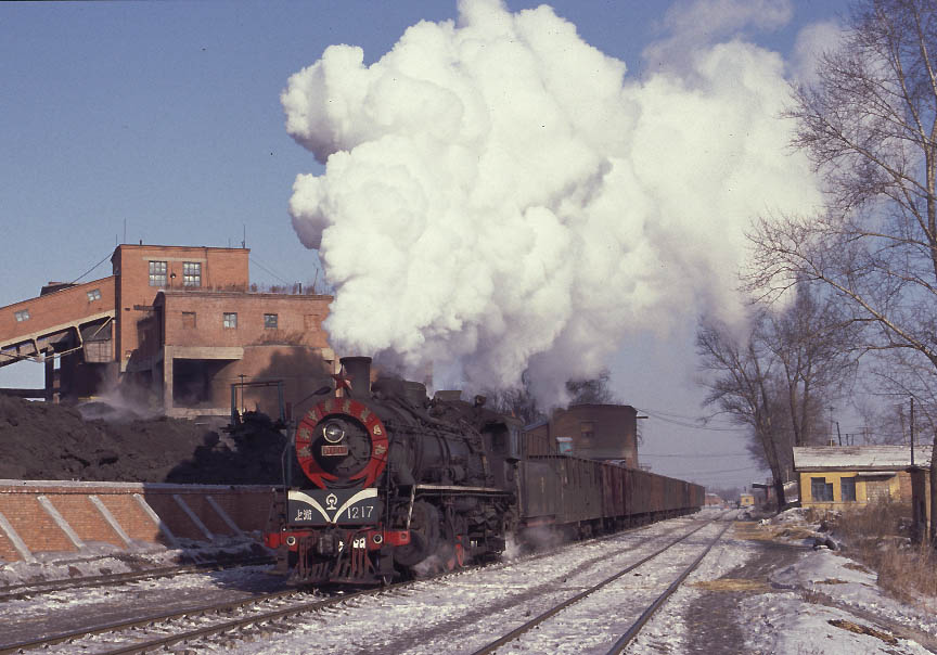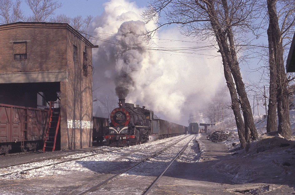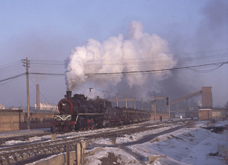 | My original plan was to ride the passenger train back to Yijing but as we arrived at Erjing a long train of empty wagons was waiting to enter into the mine yard. Time for a change of plan and a chance to catch SY1217 with its distinctive decorated smokebox as it started its heavy train. December 2004 |