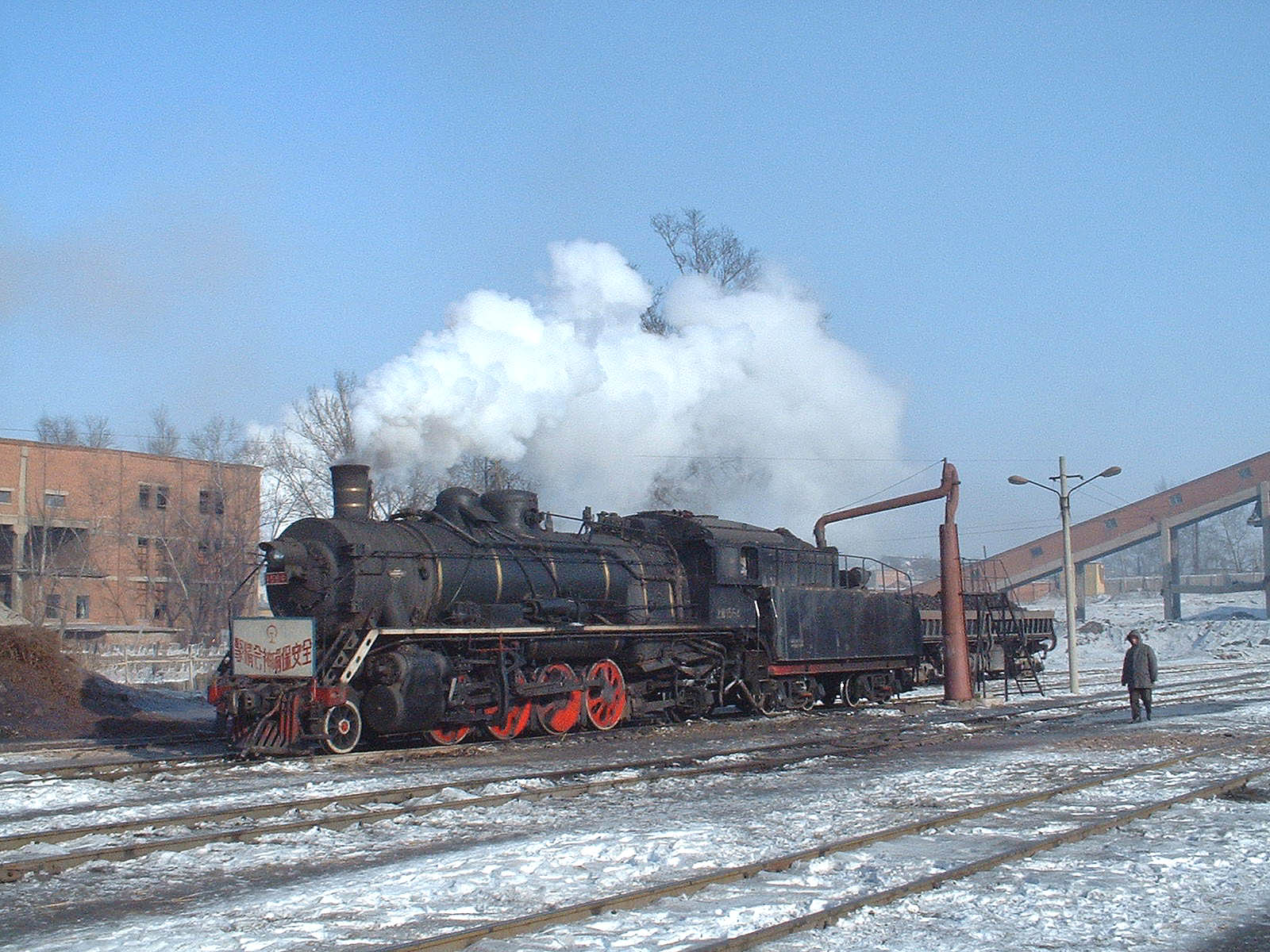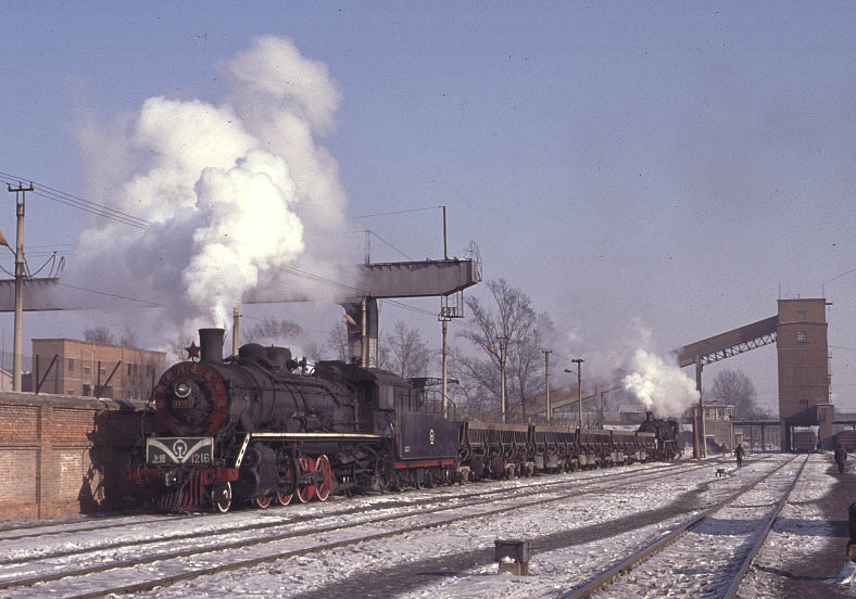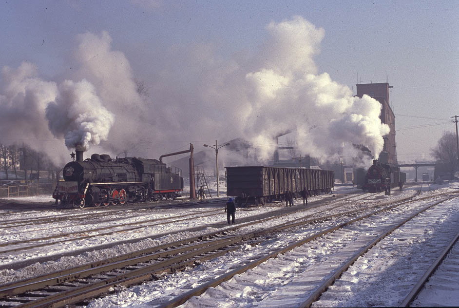 | The centre of operations is at Yijing where the maintainance depot is located. Locomotives return here from Sijing to take water and it is rare for this location to be devoid of at least one locomotive. On this occasion SY0791 takes water while SY1216 shunts wagons in the yard. December 2004 |