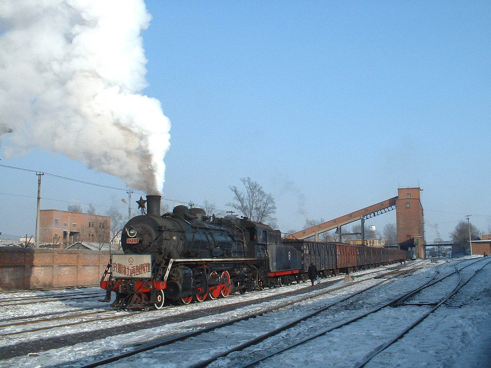 | A swift piece of relocation put me in place to catch the same train as it headed past the winding gear of Erjing mine. With temperatures standing at about -20 degrees the exhaust effects were magnificent - as was the sound of the SY hard at work December 2004 |