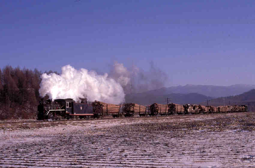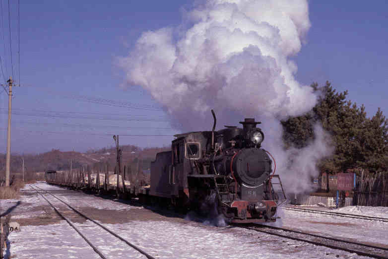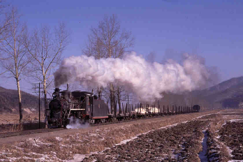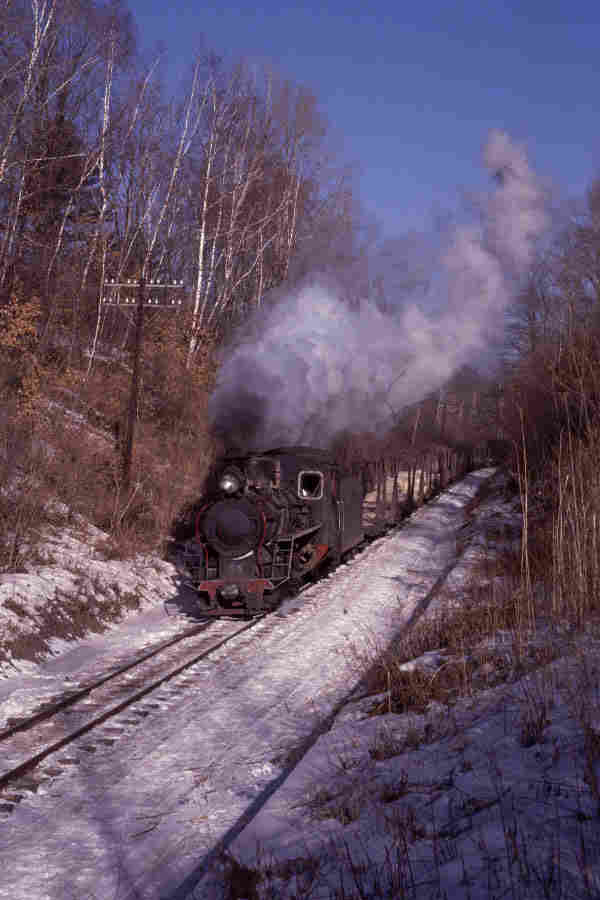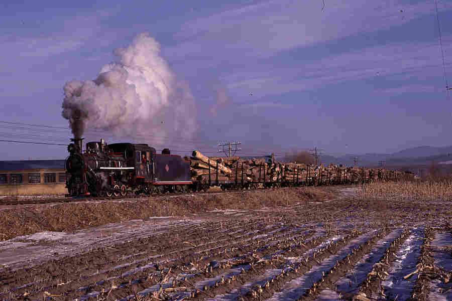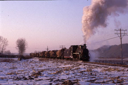 | Our visit to the North-East of China was blessed with fantastic weather and preceeded by a light dusting of snow - a terrific combination for photography. In this picture Class C2 0-8-0 No.54 passes with a train of empty log wagons between Weihe and Zhenzhu |
