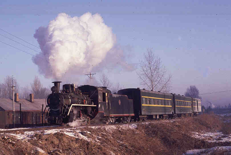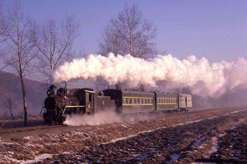 | Boxing Day 2001 - another day and another morning passenger train - Class C2 0-8-0 No.54 approaches Zhenzhu with the morning working from Weihe. The van at the rear of the train appears not to be enjoying any steam heating and it shrouded in overnight frost. |