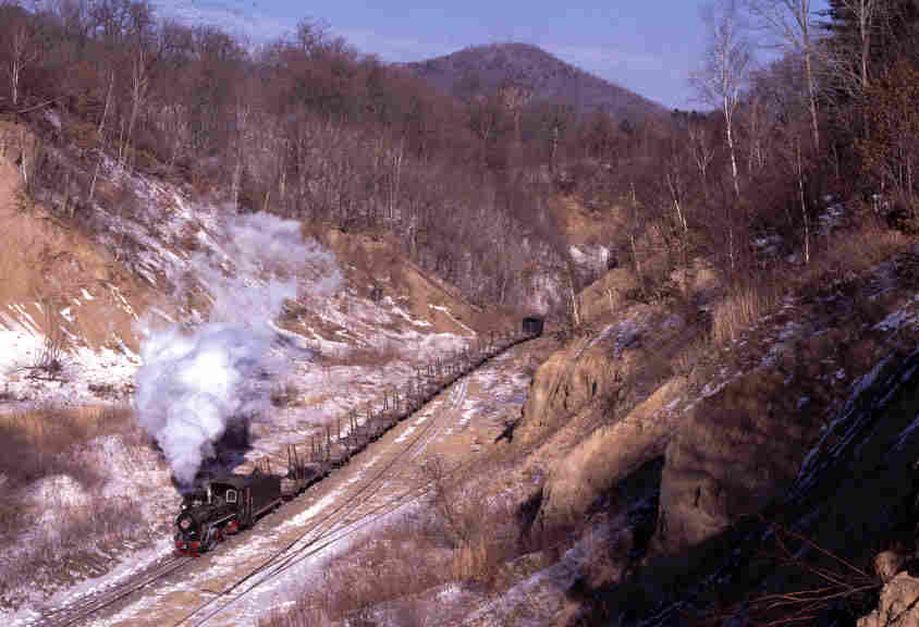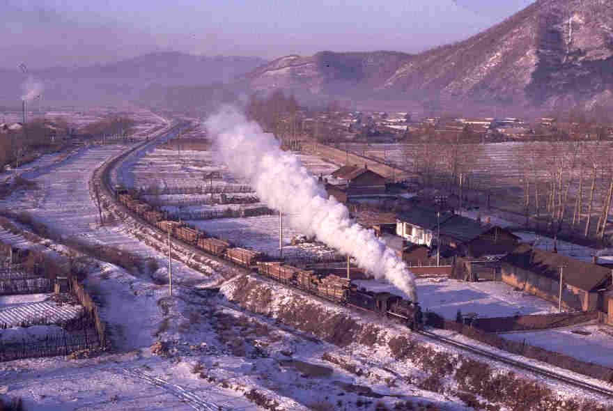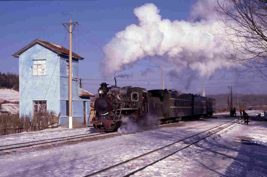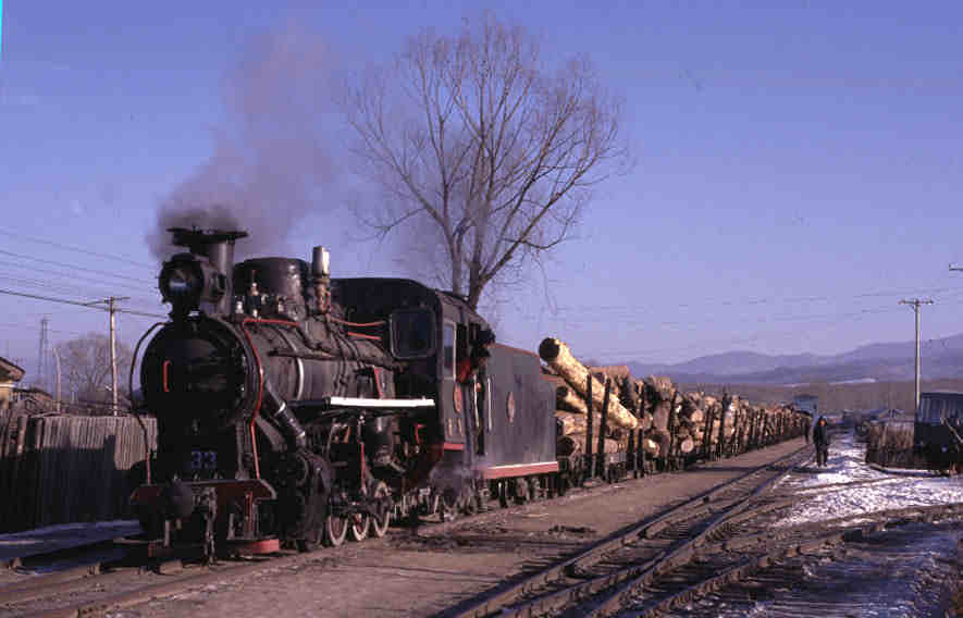 | WEIHE - IN THE FORESTS OF NORTHERN CHINA Northern China used to have a large number of narrow gauge railways built to carry timber. These were mainly in remote rural areas and in some cases were very extensive - over 150km long with large numbers of branch lines (a singularly appropriate term in connection with forestry!) The lines were 2' 6" (762mm) gauge and Class C2 0-8-0 tender locomotives were the most common locomotive type. However the combined effects of deforestation and the increased use of road transport has led to large scale closure of many of these lines. Of those that survive, none are now steam operated although some tour operators occasionally arrange special trains on some systems. The system at Weihe closed at the end of the logging season in 2003 although a tourist railway has been mooted using the locomotives from the line. Sadly what follows is therefore now an historic record of this wonderful railway line which I was fortunate enough to visit in December 2001. The visit was made with a group but all the trains were authentic workings and absolutely no effort was made to interupt the normal pattern of operation. This could be frustrating at times as we waited long periods for trains but when they did arrive there was the thrill of seeing real 'working steam'. The general pattern seemed to be to load logs during the short daylight hours and then bring trains in at night although some loaded daylight trains were seen on the move. Perhaps the most memorable of these was a train which arrived early in the morning - perhaps delayed or running late from the previous evening. We used a minibus to move from location to location although 'chasing' was almost impossible given the state of the roads (unmetalled) and the ice which covered them! |