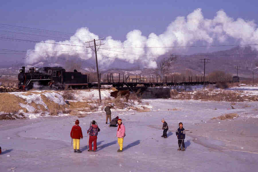| This has to be one of my all-time favourite shots from my travels in China. We were looking for a suitable location to photograph C2 class No.53 and came across this group of children playing on the ice near the village of Xiping. Although they were curious they quickly forgot we were there and carried on with their games as the train came into view and passed them by. For these children it was an everyday experience - for us it was pure magic. |
