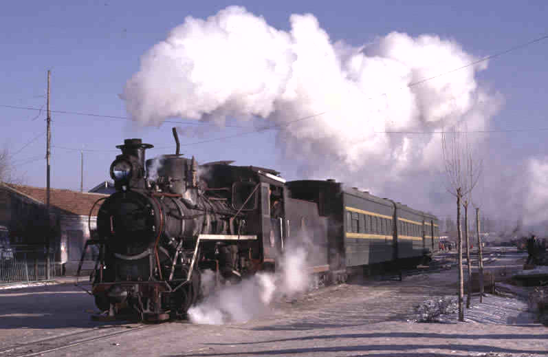 | All but one of my visits to China have taken place over the Christmas and New Year period and so I have had many memorable Christmas Days. On this occasion it was made so by sights such as this - No.54 leaving Xiping on the morning passenger train to Liushan. |