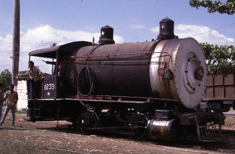 | Fireless locomotives are one of the most remarkable of all locomotives designs. Instead of the normal boiler the engine has a large tank, or reservoir, and no firebox. (above left) The tank is charged with a mixture of steam and hot water from a stationary plant and this effectively means that the locomotive is a gigantic thermos flask on wheels! In the case of Marta Abreu this was by means of a pipe leading from the mill building and in the picture No.1239 can be seen being charged (above right). Normally the boiler is charged to the normal working pressure of a traditional style of locomotive but pressure is reduced before the steam enters the cylinders. Charging time at Marta Abreu was about 20 minutes. Once the locomotive moves off and begins to use the available steam, the pressure in the boiler is reduced causing the hot water to create more steam. This continues until the pressure drops to the pont where steam is no longer created and then the locomotive must return to its charging point. These locomotives are remarkably safe and easy to operate. They were often to be found in use where there is a risk of fire or explosion, such as chemical and munition factories, although why they should be used in Cuban sugar mills is something of a mystery unless they were surplus to requirements in the USA and were brought to the island prior to the revolution. The cab of the locomotive is very simple with just a regulator and a steam brake. This makes it easy to operate and the locomotive can be used by relatively unskilled labourers. There are also low maintenance costs with very few working parts and since the locomotive is charged from the plant it does not require time to build up pressure in the normal way, making it almost instantly available for use. |