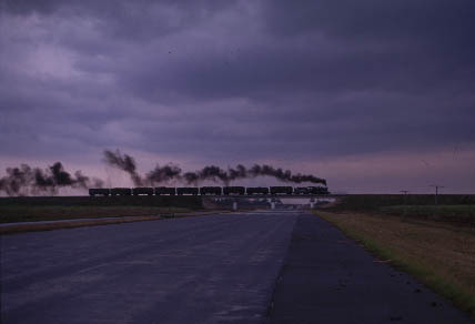 | Baldwin No.1545 assembling a long train of empty cane wagons ready to go to one of the furthest loading points (left) The afternoon thunderstorrns have only just ceased as an unidentified locomotive crosses the Great Cuban Freeway with a short train of loaded cane wagons bound for Primero de Mayo. Note the almost total absence of traffic on the motorway - quite unlike the M25 at a similar time in the afternoon! (right) |