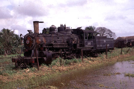 | Our arrival in Cuba in 1997 was proceeded by a period of heavy rainfall and much of the cane cutting had come to a standstill. Baldwin 2-8-0 No.1803 was found standing in light steam besides a flooded field at Amistad |