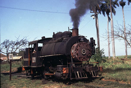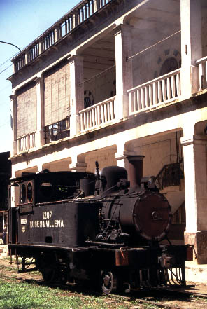 | In architectural terms at least, Ruben Martinez Villena was one of the most attractive mills in Cuba. Its main building betrayed a heavy colonial influence and provided a wonderful backdrop for the amazing fleet of engines to be found there. These included Cuba's oldest working locomotive, a Baldwin 0-4-2 built in 1878 which is steamed on high days and holidays (usually in return for a fistful of dollars!) together with several other small tank locomotives such as Vulcan 0-4-ST No.1201, Henschel 2-4-0T No.1207 and Baldwin 2-6-2T No.1311. A number of larger 2-8-0 engines were also employed to undertake the more arduous field workings. |