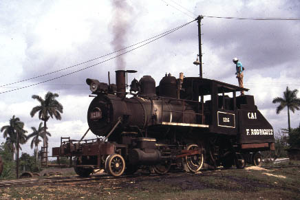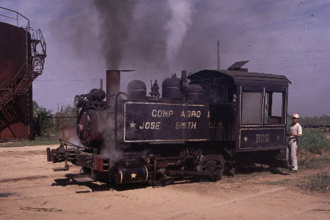 | MATANZAS - PART 2 Jose Smith Comas, Fructuroso Rodriguez, Granma, Puerto Rico Libra, Rene Fraga and Juan Avila On the north coast, close to the city of Cardenas, was one of my favourite Cuban mills - Jose Smith Comas. This mill kept its engines in particularly good order and there usually seemed to be plenty of line working. The loco shed was particularly attractive although gaining unofficial entry was difficult. However there was an excellent view to be had from the balcony of the building just across the street or from the roof of your hire car! On most occasions it paid to be early since all three engines moved off shed before 10.00am - which on one occasion was about an hour before an official shed visit by another group of visiting enthusiasts! Jose Smith Comas also had one of Cuba's more unusual locomotives in Porter 0-4-0T No.1122. This diminuitive engine must surely have been a hybrid since its cab seems totally out of proportion with the rest of the engine - however its ugliness was in many ways one of its great attractions and it was usually to be found shunting the patio area of the mill, easily moving 5 or 6 loaded cane wagons. |