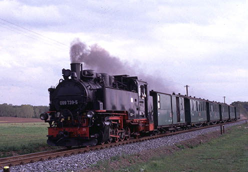 DRESDEN LINES - PART 2 A few miles north-west of Dresden is the Radebeul Ost - Radeburg line which is about 17km long and is also operated by 2-10-2T locomotives. This line currently sees eight return workings with engines leaving Radebeul smokebox first. The first few hundred yards runs alongside the main DB system before the line branches off and makes its way through the backstreets of Radebeul and then up through the gorge towards Moritzburg. Many tourists alight at Moritzburg to visit the spectacular castle before returning to Radebeul later in the day. The line itself carries on through fairly unspectacular scenery until it reaches Radeburg. Photographically the line is difficult as trains run from south to north for most of the way although there are good opportunities if you work hard enough!