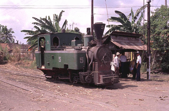 | Very much in use during my day at Jatibarang was Jung 0-8-0T No.5 (built 1916) Despite its small size and lack of bagasse wagon it was capable of hauling long trains of loaded wagons into the mill. (9 August 2004) |