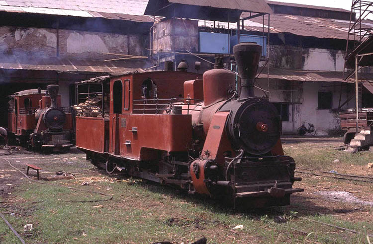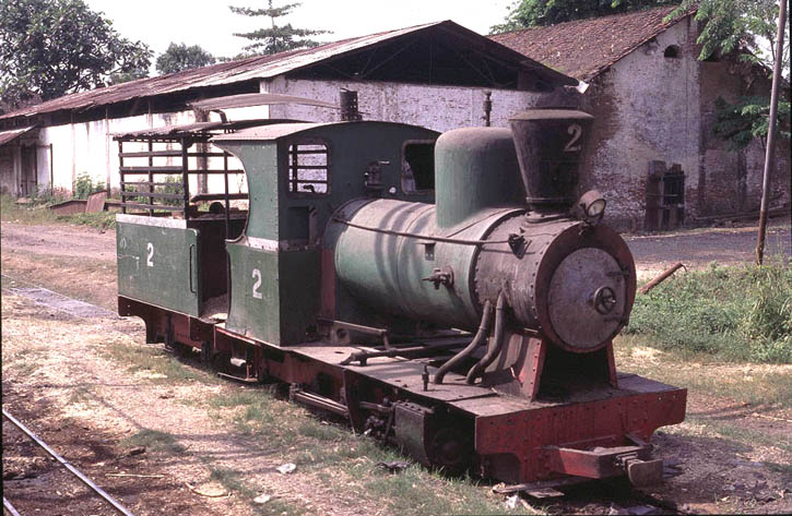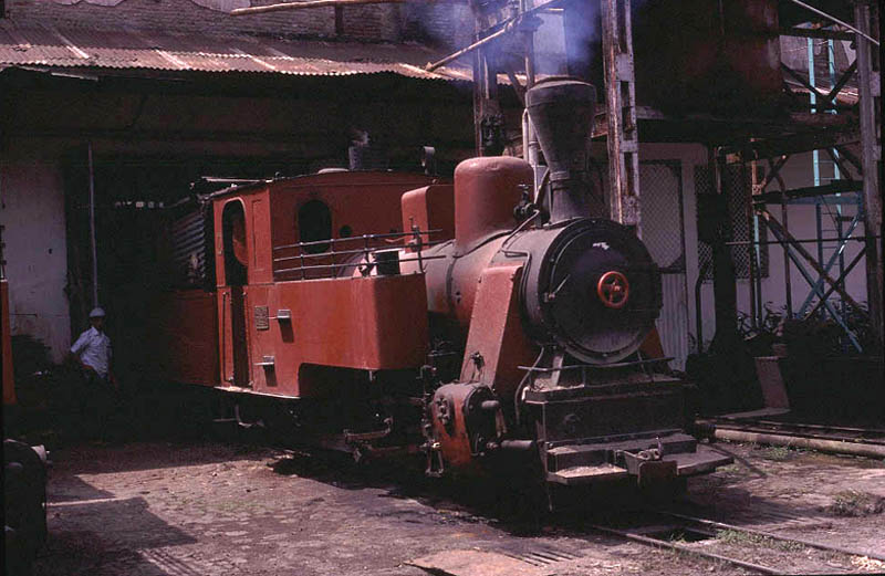 | Jatibarang (8) and Pangka (9) These two 600mm mills are located to the south of Tegal. Most, if not all, of the cut sugar cane is brought to the mills by lorry and then loaded onto railway wagons for the final journey into the crushing plant. This presumably prevents the lorries having to wait many hours to offload and allows the mills to process the cut cane both day and night. At both Jatibarang and Pangka the loaded wagons are hauled into the mill from the road delivery yard by locomotives operating boiler first and therefore presenting far more in the way of photographic opportunities than Tersana Baru. Jatibarang locomotive shed still possesses a turntable in front of a half-roundhouse although it seems to be used mainly for posing locomotives for the visiting enthusiast - and only then at a steep but negotiable price! At nearby Pangka mill there seems to be a determined effort to promote the heritage aspect of their steam locomotives. A large sign at the entrance to the mill informing visitors of this fact features a somewhat incongruous picture of an American 'smokestack' locomotive but a well illustratedand pamplet and guide book are readily available to the visitor. Pangka's locomotive fleet seem particularly well kept and the engines sport a most attractive deep red livery with highly polished number and builders plates. |