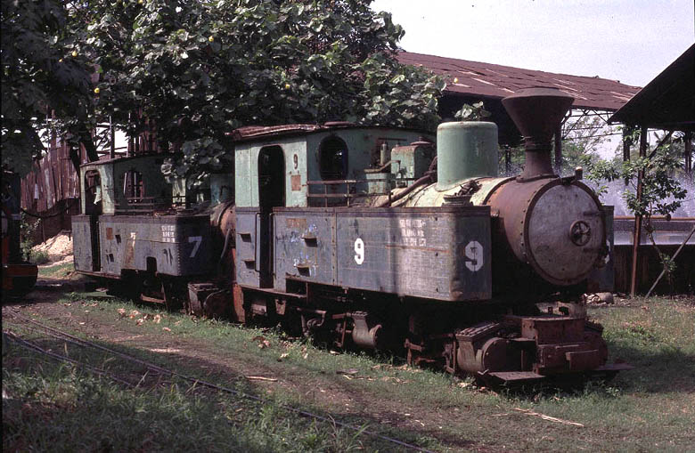 | Sadly these two Jung locomotives are unlikely to ever work again. In the foreground is 0-4-4-0T No.9 built in 1930 with 0-8-0T No.7 standing behind (9 August 2004) Update - at least one of these locomotives has been purchased and removed to the UK for preservation and restoration) |