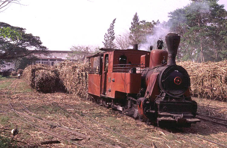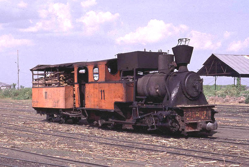 | Traditionally the locomotives use bagasse (crushed sugar cane stalks) as fuel. However the tender of Du Croo and Brauns 0-8-0T No.11 (built 1929) contains logs resulting in acrid, tear inducing smoke drifting across the yard. (7 August 2004) |