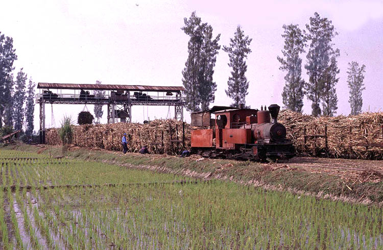 | Orenstein & Koppel No.9 stands at the head of a train of cane wagons in the road delivery yard. The gantry in the background is used to lift the loads of cane off the road vehicles and place them onto the wagons waiting below. The paddy field in the foreground lends attraction to the scene but can be perilous to the unwary (see trip report for details!) |