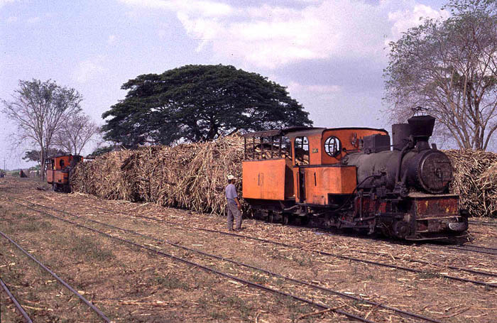 | Orenstein & Koppel 0-8-0T No.12 (built 1931) brings a long train of loaded cane wagons on the short journey from the road delivery yard to the mill buildings. The locomotive detaches from its train and propels the previous line of wagons into the mill before returning to the yard to collect its next load. (9 August 2004) |