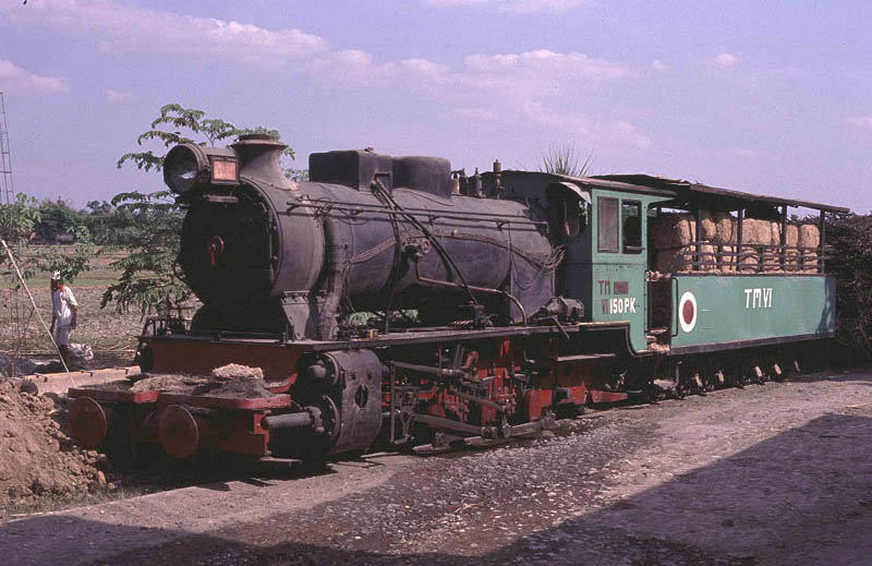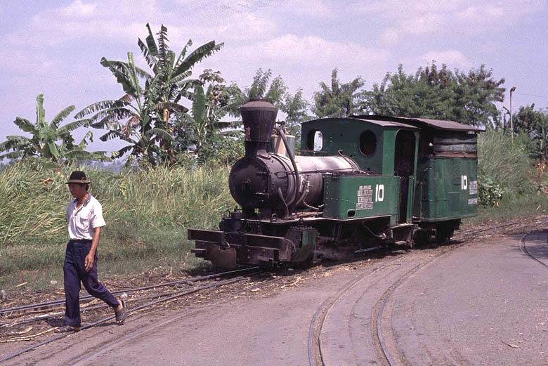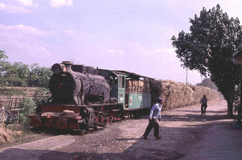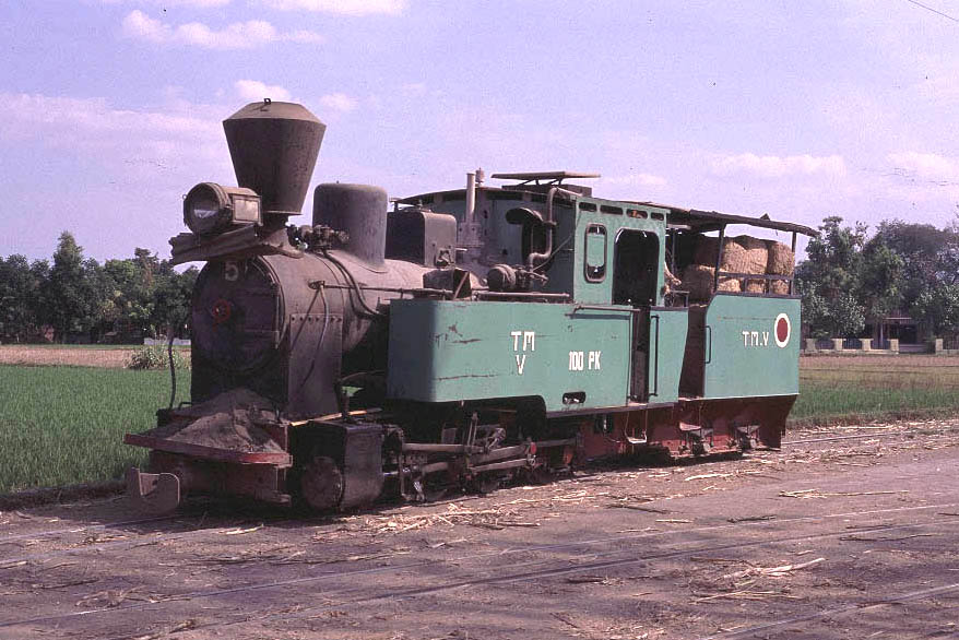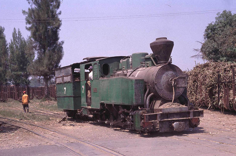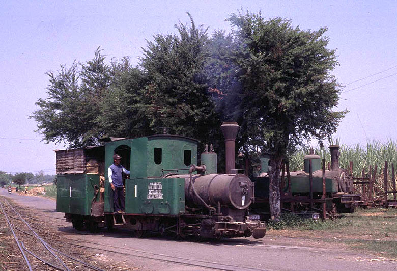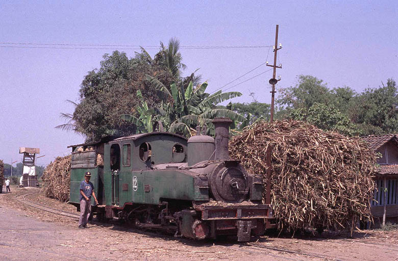| Tasik Madu (18) Tasik Madu is a 750mm gauge mill located to the east of Solo. Like other mills the steam operation is limited to moving loaded cane wagons from the road delivery yard to the main mill yard. However the two yards are about 400 metres apart and the journey involves the trains coming right through the village, providing an opportunity to photograph some real 'street running'. The other reason to visit Tasik Madu is to see the Orenstein and Koppel 0-10-0.No.VI. This locomotive uses the Luttermoller system of articulation allowing it to negotiate tight curves. . Whilst normally referred to as an 0-10-0 in fact the leading and end driving wheels are not connected to the centre drivers by means of coupling rods but instead a geared system is used to transmit the power. There are several other Luttermollers at work in Java but none of the others have the same outline as No.VI. It is truly is a magnificent beast and made the long journey entirely worthwhile. Although I only spent an afternoon at Tasik Madu it is a mill that would certainly benefit from a full day or more on the lineside to get all the shots in the best light. |