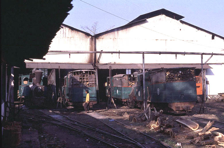 | Sumberharjo (10) Sumberharjo mill lies between Tegal and Pekalongan, close to the city of Pemalang. This 700mm gauge mill had six locomotives in steam on the day of my visit. Most of the steam working involves shunting wagons in the main yard but there is some field activity, with one engine taking out an ash train and another hauling a long rake of empty loris out to the cane fields. Left - Early morning scene at Sumberharjo shed with six locos being prepared for the day's activities. A number of derelict locomotives are also contained inside the shed |