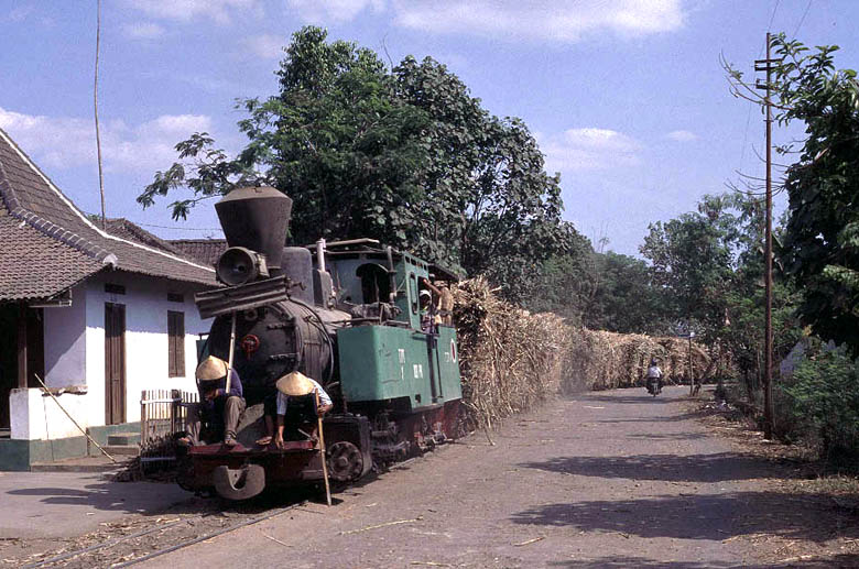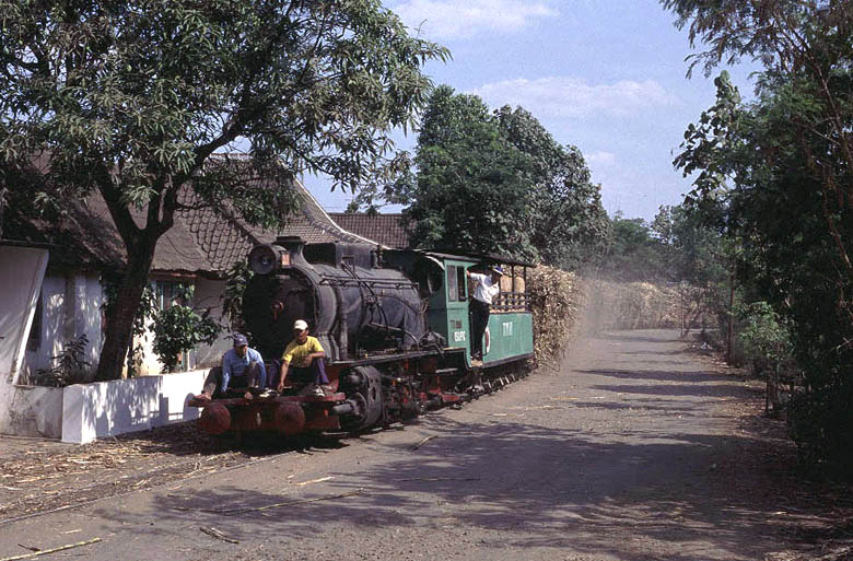 | O&K No.3 is seen leaving the mill area at Sumberharjo taking ash wagons (and a number of workers) to the fields. The ash comes from the boilers inside the sugar mill which themselves use bagasse as a fuel. |