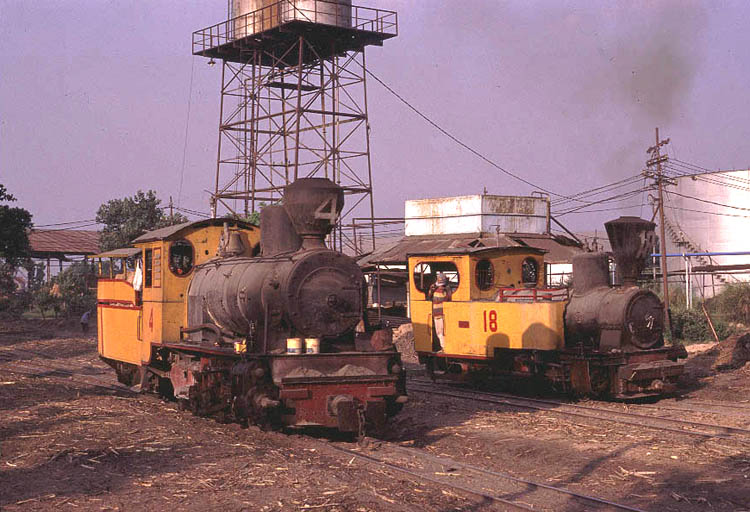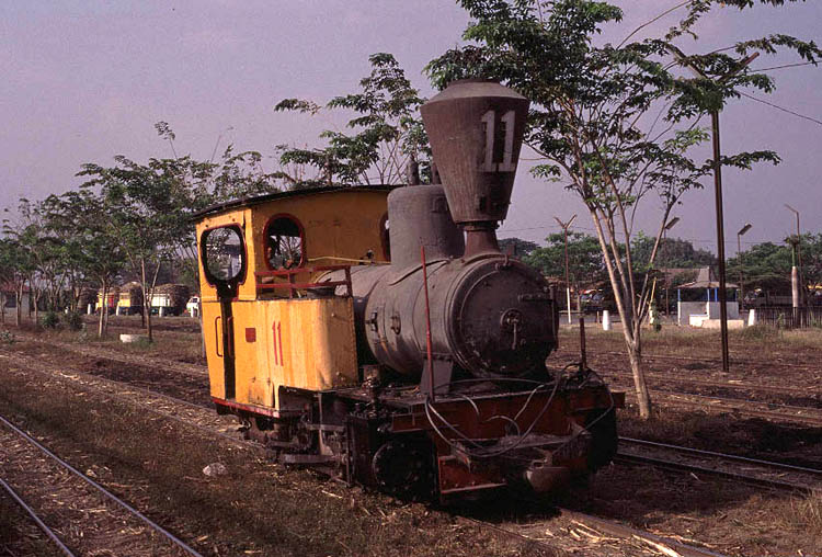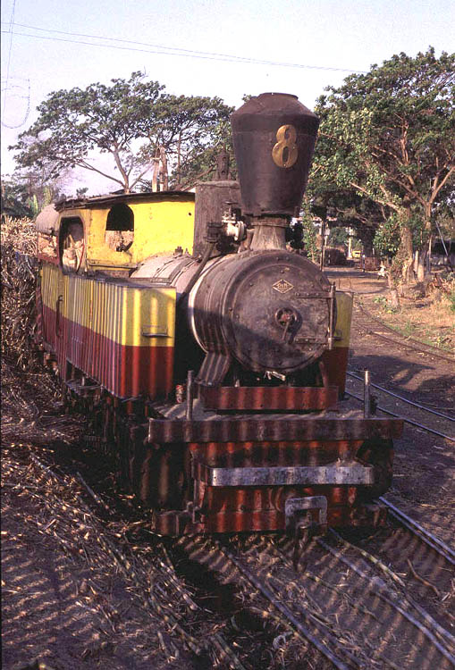 | Merican (25) I had been advised that Merican was one of the best mills at which to observe the night time fireworks display. The mill always seems to have plentiful supplies of bagasse and c^opertive emngine crews. Spending the early hours of the morning enjoying the sunrise at Mount Bromo and then travelling to Merican by bus meant that I turned up at the gates fairly late in the afternoon and so didn't really have enough time to enjoy the mill in daylight hours. The situation was further complicated by the fact that the office staff who would have normally issued my mill permit had already gone home and the security guards took some time to find a way of extracting my fee and issuing the necessary paperwork. By late afternoon the main yard was full of loaded cane wagons and most locomotives were sitting patiently in the road delivery yard awaiting their turn to move their trains. With lengthening shadows it was only really possible to get half-decent shots of the engines in their red and yellow livery before waiting for the sun to set and the show to begin. (Left) The shadows of the fence are already beginning to obscure Orensteain and Koppel 0-8-0T No.8 (built 1927) as it waits in the road delivery yard |