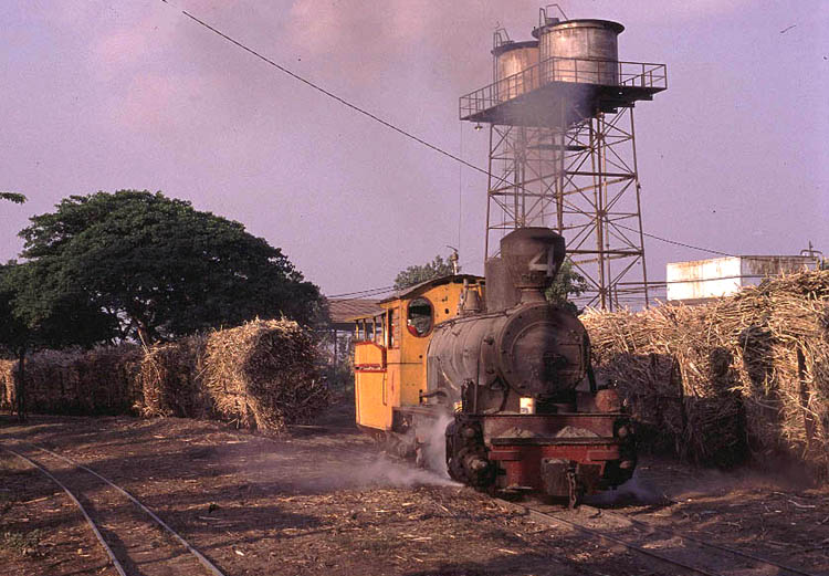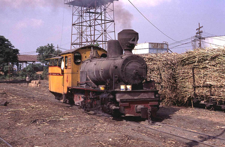 | A second Orenstein and Koppel was also waiting in the road delivery yard. Orenstein and Koppel 0-4-2T No.5 is slightly younger than here two sister engines, not having been built until 1923. The bagasse trailer appears to be loaded to the very roof |