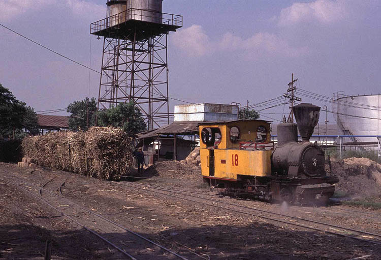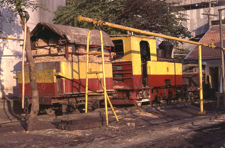 | Gempolkerep (31) This 700mm gauge mill is located on the outskirts of Mojokerto. As with so many other mills the steam operation is limited to bringing wagons from the road delivery yard to the mill but the final part of the operation is particularly interesting. Locomotives are connected to the train of loaded wagons by a long steel hawser. As the train approaches the mill it takes one track and the points are changed between the engine passing and the wagons arriving! This means that the wagons take a parallel road to the locomotive which can then be released to return to the main yard. Just what would happen if one of the hawsers snapped whilst under tension is perhaps best left to the imagination. Gempolkerep is also home to a pair of Orenstein and Koppel 0-10-0 Luttermollers but unfortunately on the day of my visit one of them was undergoing a boiler washout. |