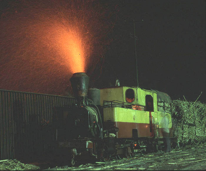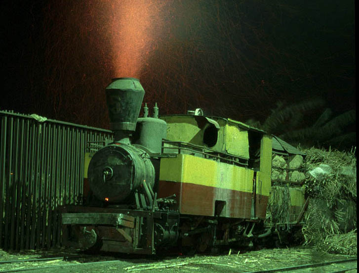 | JAVA STEAM BY DAY AND NIGHT One of the inspirations for visiting Java was provided by some Colin Garratt photographs which appeared in a book which I was given many years ago. These included a series of images of Javanese locomotives taken at night with vast trails of sparks emitting from the chimneys. The effects are extremely dramatic and are caused by locomotives burning bagasse. Because the bagasse is so fibrous a considerable amount passes through the firebox and along the boiler tubes without being fully burned until it is ejected from the chimney where it catches light. In daylight hours this process goes largely unnoticed except for the tiny pinprick holes which appear in your t-shirt as the sparks land on your clothing! At night however it is a different story! All that is required is for the crew to add some more bagasse bales to the fire or turn on the blower and suddenly the sky erupts into a spectacular firework display! For the price of a local packet of cigarettes such moments can be had to order, thus removing the unpredicable nature of such proceedings. |