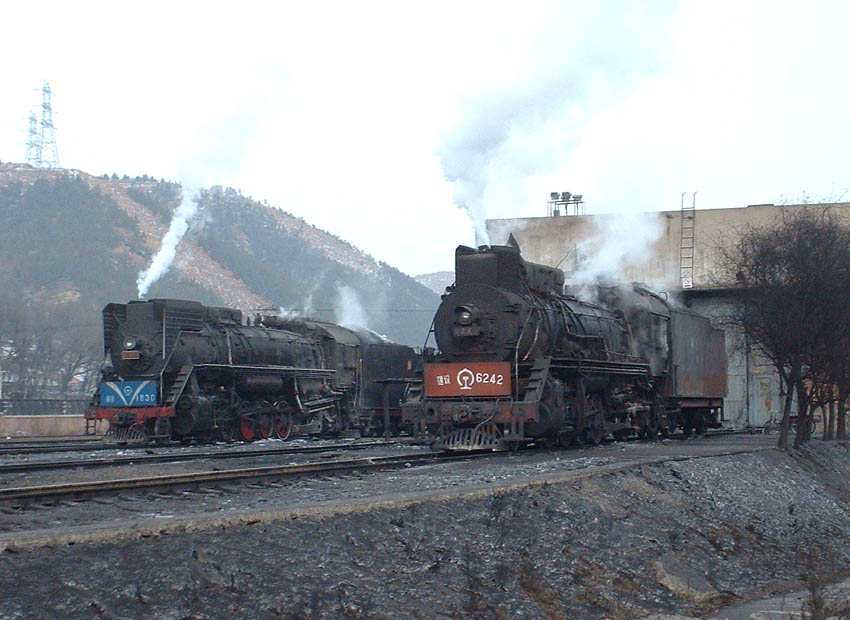 | Mudanjiang � January 2nd Up early and to the station for the 06.13 departure. Shortly before arriving at Mudanjiang the train passed the power station to the north of the city where QJ1830 and JS6242 were �top and tailing� a train of loaded coal wagons. Mike Ma was once again waiting to meet me at the station and at his suggestion we took an 18Y taxi ride out to the power station to take a closer look. We were refused entry at the southern end of the plant but advised to walk alongside the CNR tracks to the northern end where we would be able to see the engines outside the shed. Once there, Mike sent me to get my shots while he engaged the security guard in conversation. He explained to Mike that entry to the site was not allowed � oblivious to the fact that I was already taking my pictures. In fact no-one challenged me and I suspect no-one even noticed I was there. It was a great way to finish the trip with the two engines side by side outside the shed and QJ1675 inside, out of steam but still warmFrom Mudanjiang I took a China Southern flight back to Beijing, departing at 16.40 and arriving in Beijing at 18.30 � a saving of over 18 hours on the equivalent train journey although about three times more expensive than a soft sleeper. |
