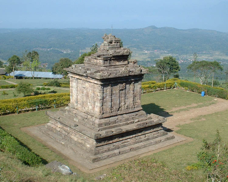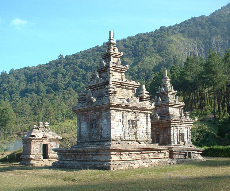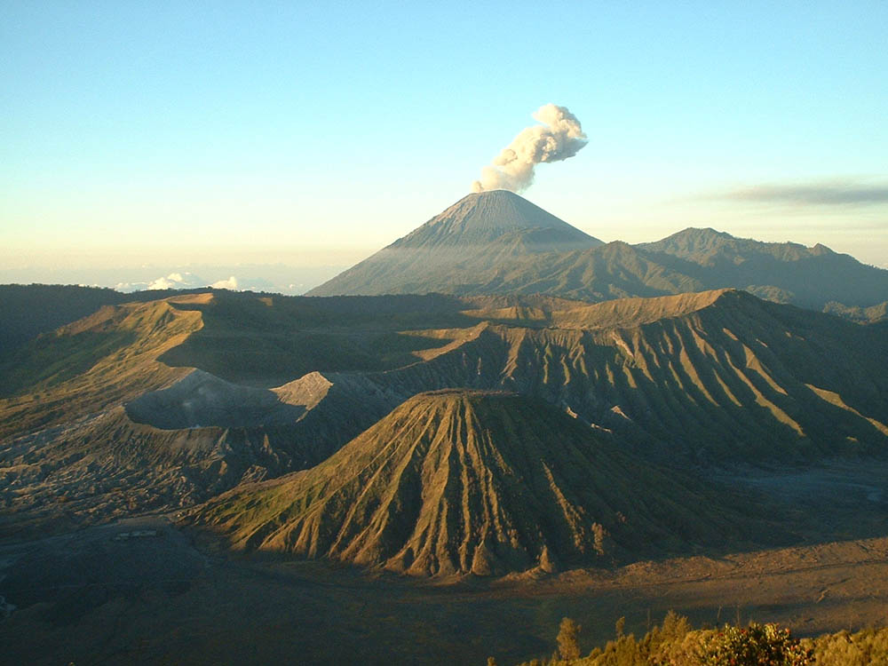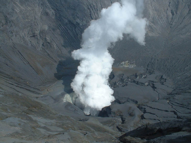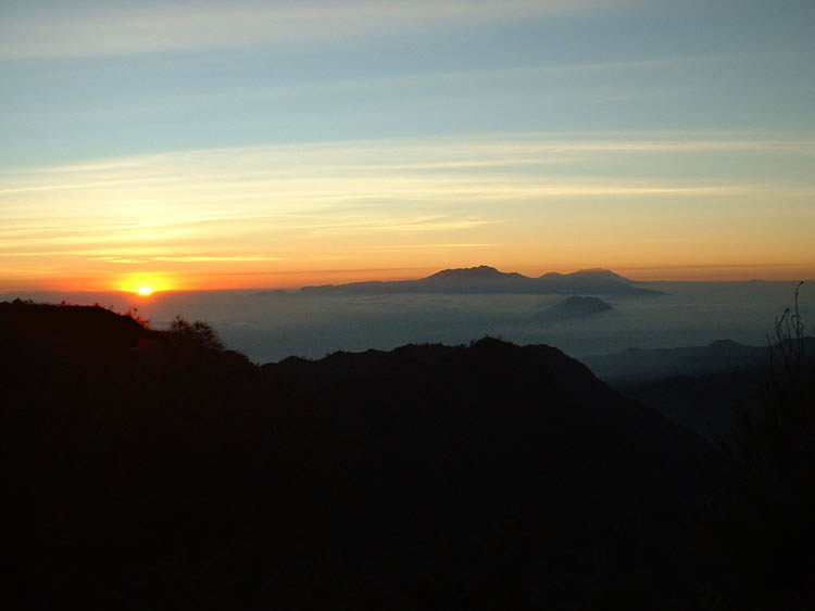 | Top left - Looking down into the vent of Mount Bromo. Two tourists were killed when Bromo erupted violently in June 2004. Above - The sun rises just above the horizon at 5.30am as seen from the top of Mount Panankaran. Lower left - Surely one of the most spectacular sights in Java. The early morning light falls onto the smoking crater of Mt Bromo in the left hand foreground and onto the sides of Mt.Batok. Meanwhile in the background a vast cloud of ash and smoke erupts from Mr Semeru - this happens at roughly 45 minute intervals. Mt Semeru is the second most active volcano on the island. |