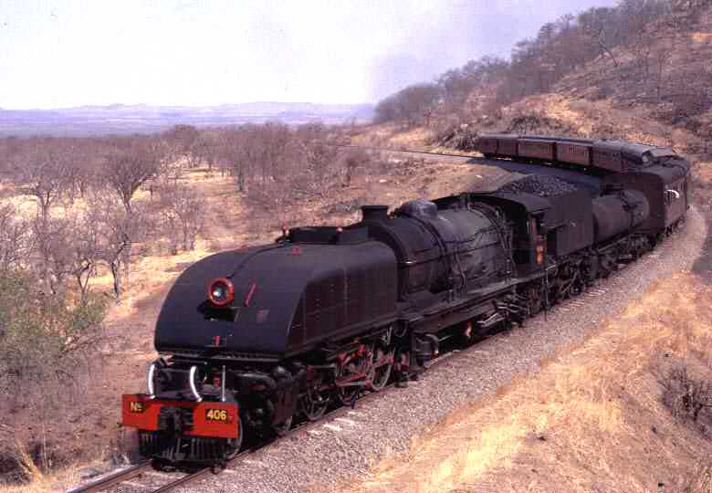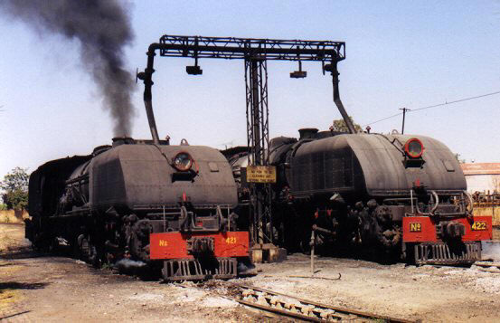 ZIMBABWE - LAST DAYS OF THE BEYER-GARRATTS The Garratt locomotive is almost synonimous with Africa although Garratt locomotives were to be found in many other parts of the world including Britain.� Many of those used in Africa were built by Beyer Peacock of Manchester and so are known as Beyer-Garratts.� These articulated locomotives have two frames with their own driving wheels and cylinders surmounted by water tanks.� Separating the two chassis is another frame carrying the boiler, cab and fuel supply.�� This type of locomotive is invaluable on lightly laid track and where sharp curves need to be negotiated.