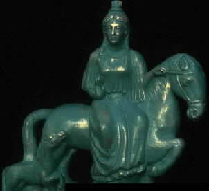 THE FRMINIST COMPANIONTO MYTHOLOGY. edited by Larrington, Carolyn. Hammersmith, London. Pandora Press. 1992, 125 -127 Epona is well known to Celtic scholars through her possible connections with the figure of Rhiannon in Pedeir Keinc Y Mabinogi. Her name is associated with the Celtic word for horse. As a goddess, images of her appear in many Celtic contexts, but there are patterns of variation and localization which caution against a too-ready tendency to think of her in pan-Celtic terms. Epona is always accompanied by a horse, either riding (most common in northern Gaul, Germany and Burgundy) or in the midst of several horses (mostly in the Rhineland). There was a shrine dedicated to her in Burgundy (Magne and Thevenot, 1953), a region particularly rich in images of the goddess. Here, she is accompanied by a foal eating from an outstretched patera or sleeping under the feet of the goddess's mare. Her role was complex and may in part be contingent on where and when she was worshipped rather than on some overall conception of her function. Her status as horse-goddess venerated by the Roman cavalry helped spread her cult (Linduff and Oaks in Henig, 1986, pp. 817-37), and is an example of Celtic influence on Roman civilization. Epona was the only Gaulish goddess to be officially honoured in Rome and had her own festival. Some dedications indicate that her devotees were members of cavalry units. Although male gods are associated with horses, and the cavalry was certainly a male domain, the goddess Epona presided over the health and fertility of the animal. She rides side-saddle in a ladylike manner and, to the extent that one can interpret the images in this way, her demeanour is benign. In other words, there is nothing in the imagery which would imply a war- goddess. She holds objects of fertility rather than weapons - a dish from which the foal often feeds, fruit or a cornucopia. Burgundy, the tribal homelands of the Aedui, where the goddess riding side-saddle with a foal is most common, was a centre for horse breeding. The Treveri, centred on Luxembourg, also seem to have favoured the goddess as we can assume from the number of images here. Her importance was certainly linked to that of the horse itself in Celtic society. It has been suggested that her cult, because of her association with horses, was popular among the Gaulish elite, and this in itself would help explain her popularity (Linduff and Oaks in Henig, 1986, pp. 817-37). Equine associations are not the end of Epona's story. Many images depict her as carrying food, a cornucopia or some object of plenty consistent with her role as benefactress/guardian of horses and probably extending beyond that. Several images have been found in conjunction with therapeutic springs and in one striking instance, she appears as a water-nymph reclining on her mare. The Mediomatrici, centred on Metz, near modern Strasbourg, certainly venerated the horse-goddess, and here she may have functioned as a guardian of the dead. One image shows her on her horse seemingly leading an individual on a journey to the afterlife. A dedication from Burgundy (Ross, 1967) links her specifically with the mother- goddesses. These may be local adaptations, but with so little evidence and with such ambiguous imagery it is impossible to be too didactic. Epona could have been a horse goddess in origin whose function later became extended to include protection of humans, healing water and guardianship of the dead. On the other hand, the cultural importance of the horse, the prestige of the Roman cavalry and their social importance could have resulted in the equine associations becoming dominant from a wider spectrum of functions. About any myths associated with her, we know nothing, and it is noteworthy that even with such a comparatively well-attested figure as Epona, firm conclusions are impossible. Epona occurs but rarely in Britain and the best preserved image of her depicts her between two little horses who feed from a dish of food, an image popular in what is now Germany. It is possible that her appearance in Britain is linked to the presence of Roman legionary troops, but she is without doubt a Celtic deity, and we can assume, on the basis of archaeological evidence, that various Celtic tribes venerated a basically benign female deity, associated with horses and possessing, at least in some areas, mother-goddess characteristics directed to humanity. The question then arises, what later material could carry some of these associations? The most obvious is the figure of Rhiannon, the mother of Pryderi who appears in the First and Third Branches of Pedeir Keine Y Mabinogi. Y Pedeir Keinc comprise the first four tales in a collection of Welsh medieval narratives know collectively as the Mabinogion (Jones and Jones, 1989). These narratives appear quite late in terms of the time-scale we have been considering , after the British Celts had been exposed to Roman, Christian and Anglo-Norman influence and had become Welsh into the bargain. Nevertheless, no one seriously questions the essentially native qualities of the tales or that they reflect to some extent older cultural codes and practices. Conway, D. J. MAGICK OF the GODS & GODDESSES. St. Paul, Minnesota, Llewellyn Publications, 1997, 223 EPONA-Britain, Gaul. "Divine Horse"; "The Great Mare"; Goddess of horses; Mother Goddess. Fertility, maternity, protectress of horses, horse-breeding, prosperity, dogs, healing springs, crops. |
