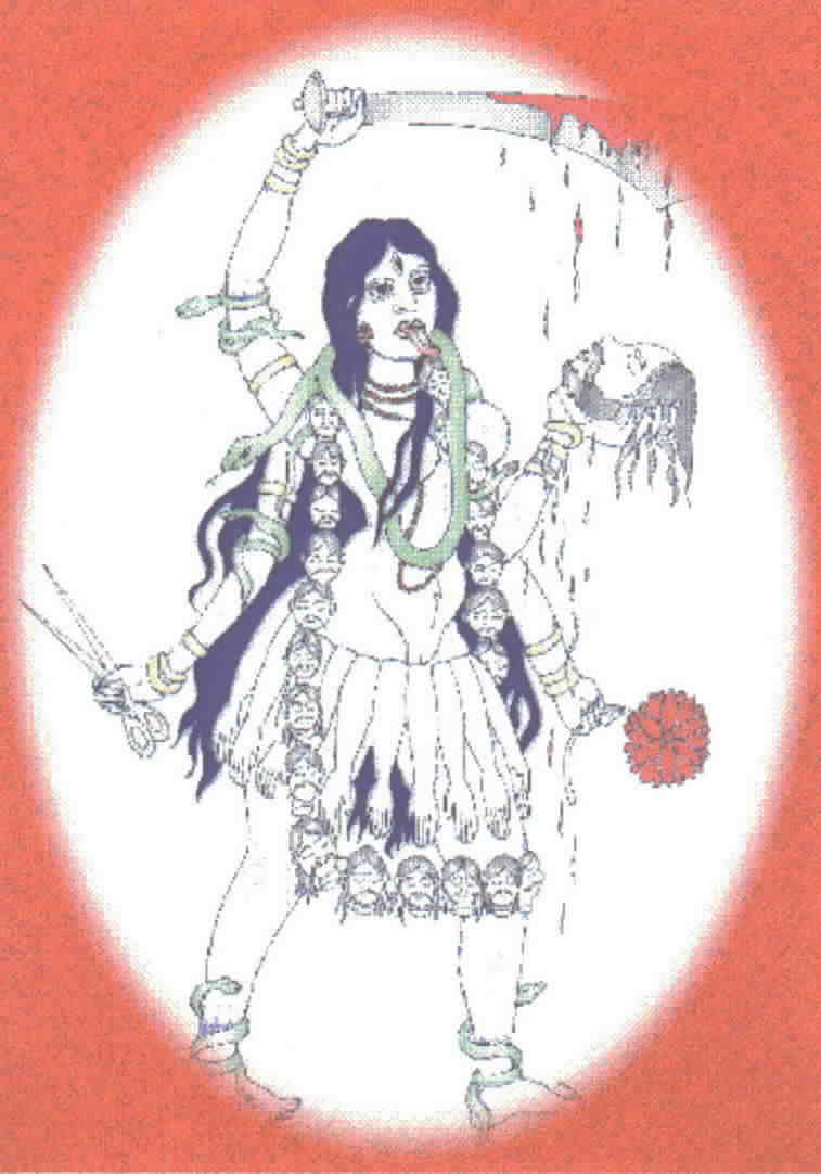 ~ Kali ~~~~~ Kali, who destroyed Kal (Time itself), is widely worshipped in India as the goddess of terror and the lower classes are particularly devoted to her. Most of the devil dances, dark rites and obscene ceremonies practiced in India by the lower orders can be traced to her. She is the Goddess of Epidemics and cataclysms. She is evidently of non-Aryan origin, a relic of aboriginal savagery incorporated in Hinduism as the personification of destruction.