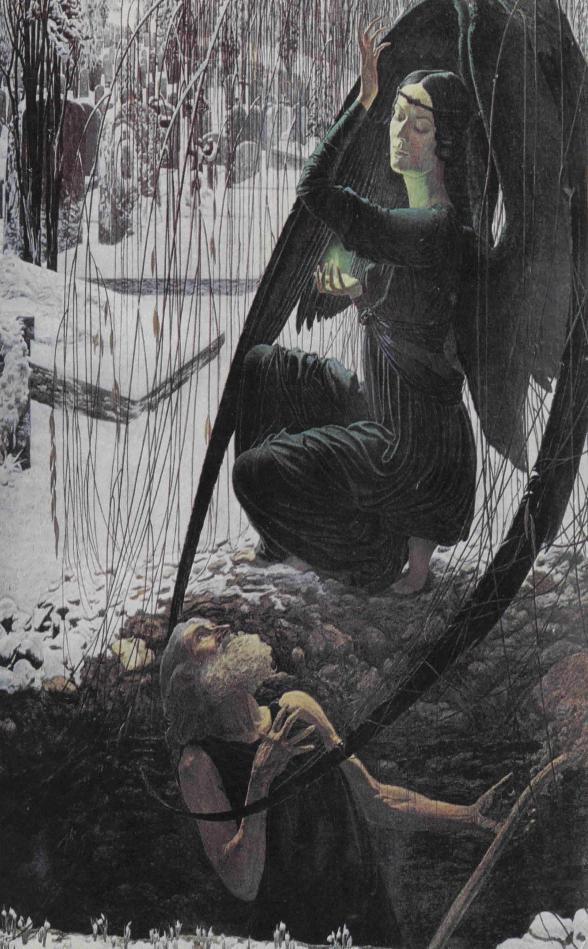 "Like Macha , the Crone aspect of the Morrigan, Morgan as Mother Death cast the destroying curse on every man."