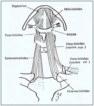 | Infra-hióideos: Esterno-hióideo, Omo-hióideo, Esternotireóideo e Tiro-hióideo. | Agem como um grupo para abaixar a laringe, o osso hióide e o assoalho da boca. |