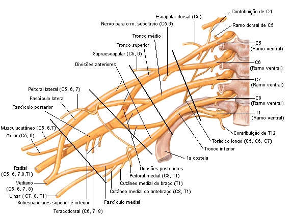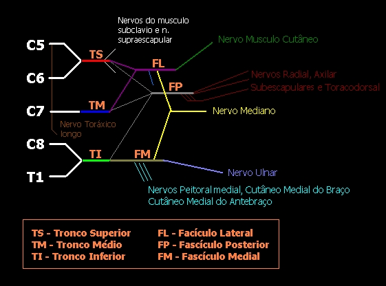 - Cada um dos troncos emite um Ramo Posterior que vão se unir e formar o Fascículo Posterior. O Tronco Superior e o Tronco Médio emitem Ramos Anteriores, que vão unir-se e originar o Fascículo Lateral. A continuação do Tronco Inferior origina o Fascículo Medial. Observar que do Tronco Superior originam-se também nervos colaterais, o Nervo do Músculo Subclávio e o Nervo Supraescapular.