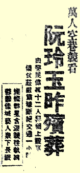 据上海妇女杂志《玲珑》1935年3月中旬的期刊报导《阮玲玉自杀详情》记载,全文如下(选段):
