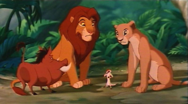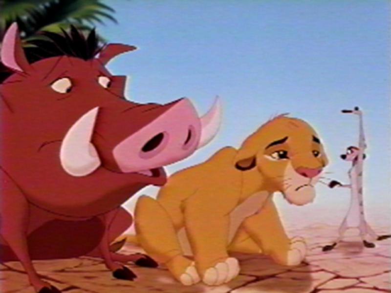 | Back at Pride Rock, Scar announces to the lionesses that Mufasa and Simba were dead, and that he was assuming the throne, along with all his hyena helpers. Meanwhile, Simba was rescued by Timon, a meerkat, and Pumbaa, a warthog. They taught him 'hakuna matata', or 'no worries', and how to eat bugs. Simba grows up living this way, but one night while the three were star gazing, Simba said, "Somebody once told me that the great kings of the past are up there, watching over us." Timon and Pumbaa laughed, so Simba lay down somewhere else, his breathing blew some seeds away to Rafiki's tree. Rafiki sniffed them, and he knew that Simba was alive an that Scar had lied. |