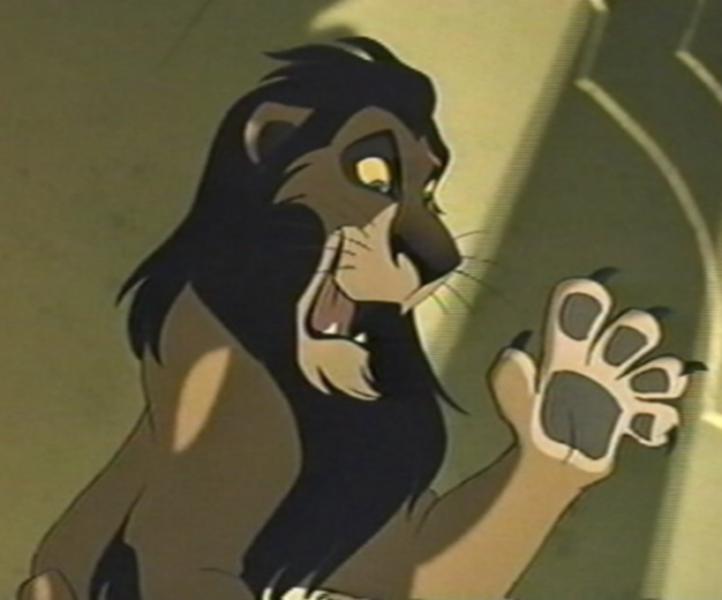 | Mufasa leaped into the gorge, picked up Simba, and put him up on a ledge. Mufasa jumped up near Scar. "Brother, help me!" he called. Scar dug his claws in Mufasa's paw. "Long live the king," Scar growled, and pushed Mufasa down the cliff. |